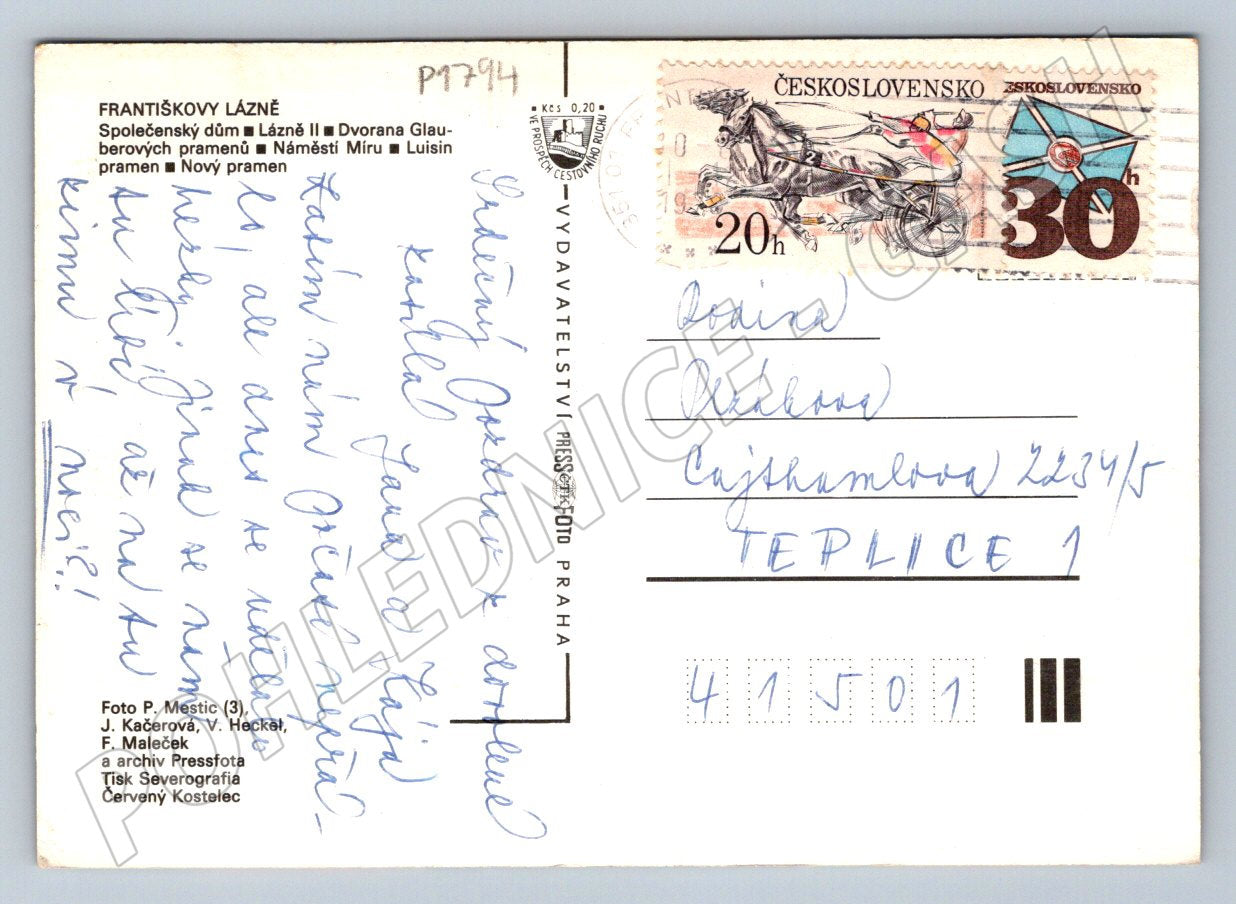 Originální pohlednice z Františkových Lázní, zobrazující významné památky, parky a lázeňské budovy tohoto známého českého lázeňského města. Na přední straně najdete koláž barevných fotografií hlavních dominant (lázeňské domy, prameny, parky) a mapku centra Františkových Lázní. Rubová strana obsahuje ručně psaný pozdrav a československé poštovní známky z období socialismu. Pohlednice je skvělým sběratelským kouskem nebo upomínkou na návštěvu Františkových Lázní. Vhodné pro sběratele historických pohlednic, zájemce o lázeňská města, i milovníky českých reálií.