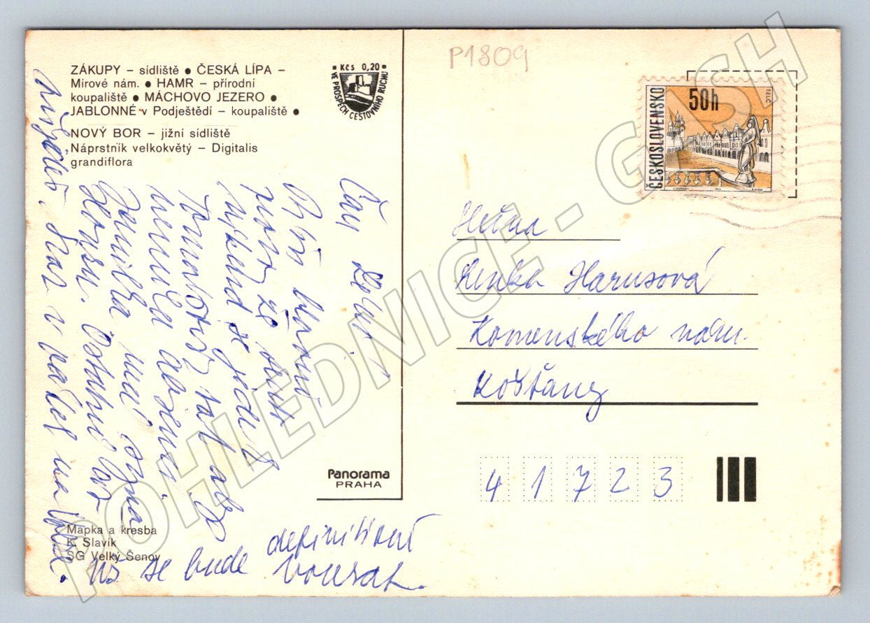 Originální barevná pohlednice z oblasti Česká Lípa (Českolipsko), která ukazuje koláž fotografií významných míst této oblasti včetně koupališť, sídliště a přírodních scenérií. Na přední straně je výrazná mapa regionu a několik dobových fotografií z rekreačních oblastí, fontány a městských staveb. Na zadní straně je ručně psaný text, poštovní známka z období Československa v hodnotě 50 haléřů a adresní pole vyplněné perem. Stopy stáří i běžného použití. Skvělý sběratelský kousek pro milovníky regionálních pohlednic z minulého století.