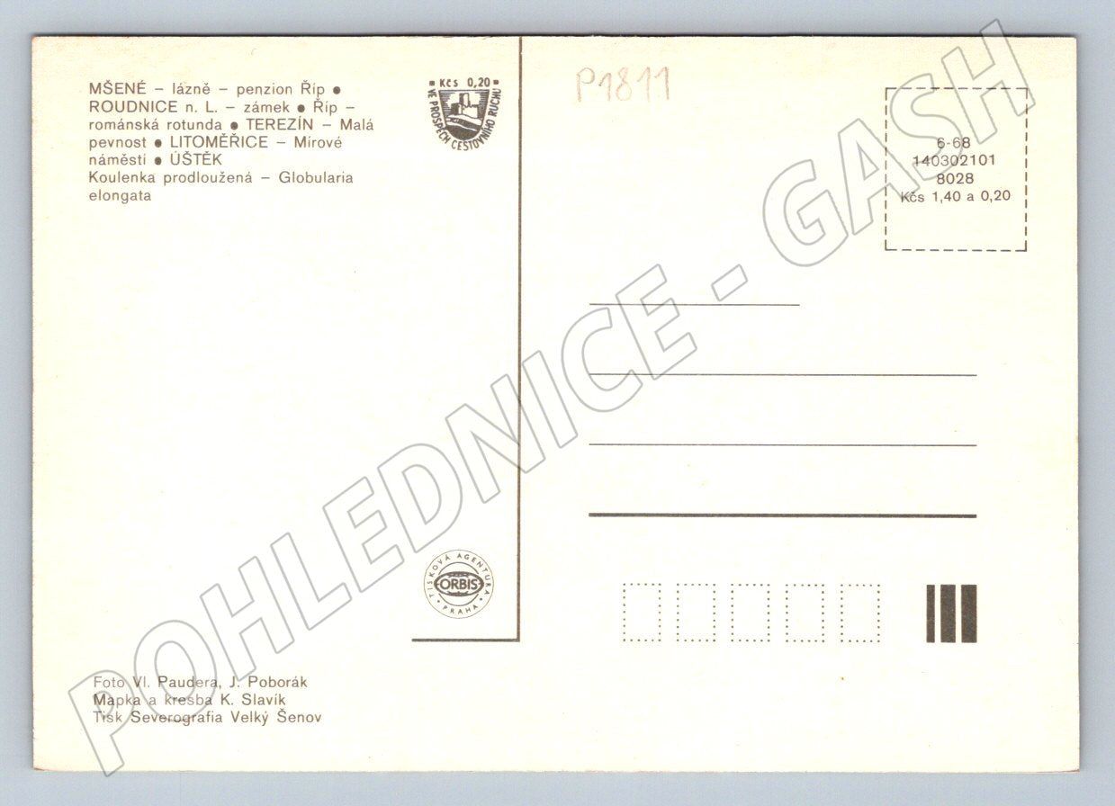 Originální pohlednice znázorňující oblast Litoměřicka. Na přední straně je mapa s významnými místy regionu (Litoměřice, Terezín, Roudnice n. L., Mšené, Úštěk) a barevné fotografie lokálních památek, budov a krajiny. Mezi zobrazenými lokalitami jsou románská rotunda, zámek, pevnost v Terezíně, Mírové náměstí v Litoměřicích a lázně v Mšeném. Texty na zadní straně popisují nejzajímavější místa oblasti včetně poznámky o vzácné rostlině - koulenka prodloužená (Globularia elongata). Vydal Orbis Praha. Pohlednice je v pěkném sběratelském stavu, čistá bez adresy a známky.