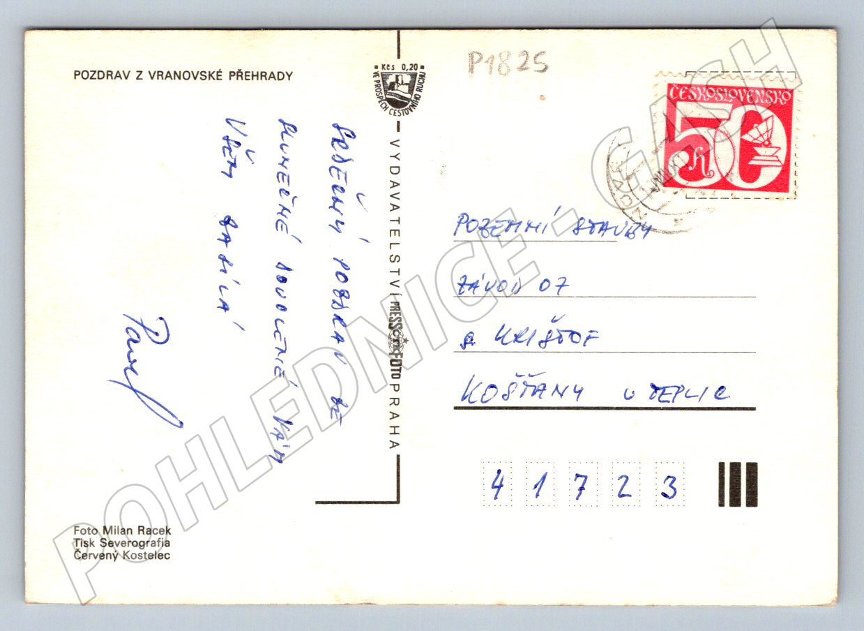 Originální pohlednice s motivem Vranovské přehrady. Na přední straně jsou fotografie s plachetnicemi na vodní nádrži, letecký pohled na přehradu a mapa oblasti. Pohlednice má známku z období Československa, razítko a ručně psaný vzkaz. Vydal Foto Milan Racek, tisk Severografia, Červený Kostelec. Ideální sběratelský kousek pro milovníky vodní dopravy a českých přehrad. Stav odpovídá stáří, mírné známky používání.