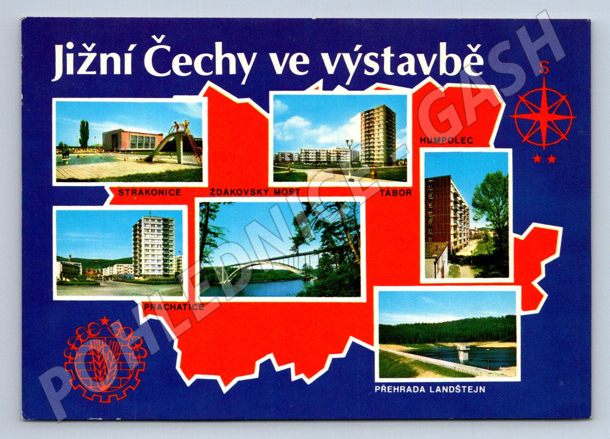 Pohlednice Jižní Čechy ve výstavbě zachycuje období rozsáhlé výstavby v jižních Čechách, pravděpodobně z 70. nebo 80. let 20. století. Na přední straně pohlednice jsou fotografie významných staveb a moderních čtvrtí měst Strakonice, Tábor, Prachatice, Humpolec a také inženýrské stavby – Žďákovský most a přehrada Landštejn. Pohlednice je v zachovalém stavu, neprošlá poštou, a nabízí dobovou dokumentaci rozvoje českých měst v socialistickém duchu. Zadní strana obsahuje popis jednotlivých staveb a vydavatele ORBIS Praha. Ideální doplněk pro sběratele tematických pohlednic nebo zájemce o historii české architektury a urbanismu.