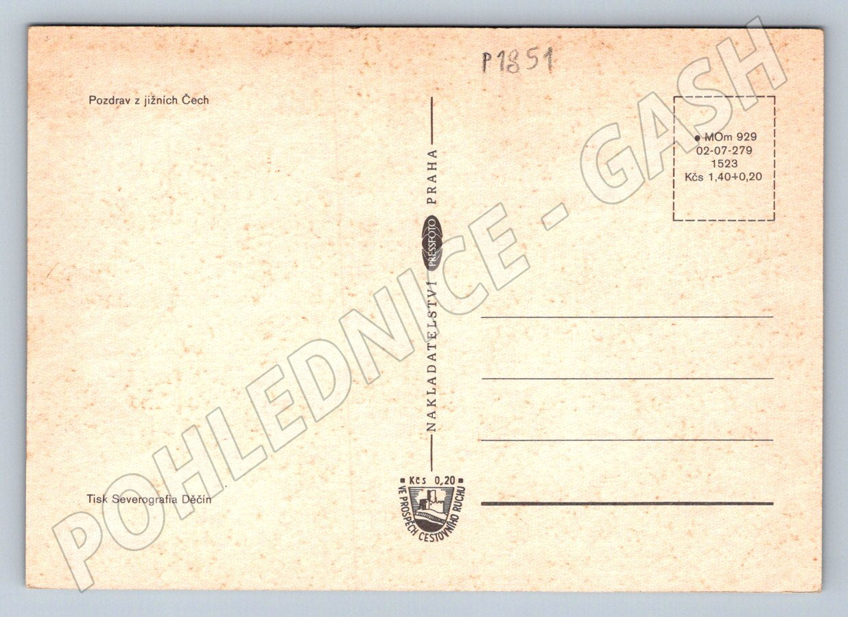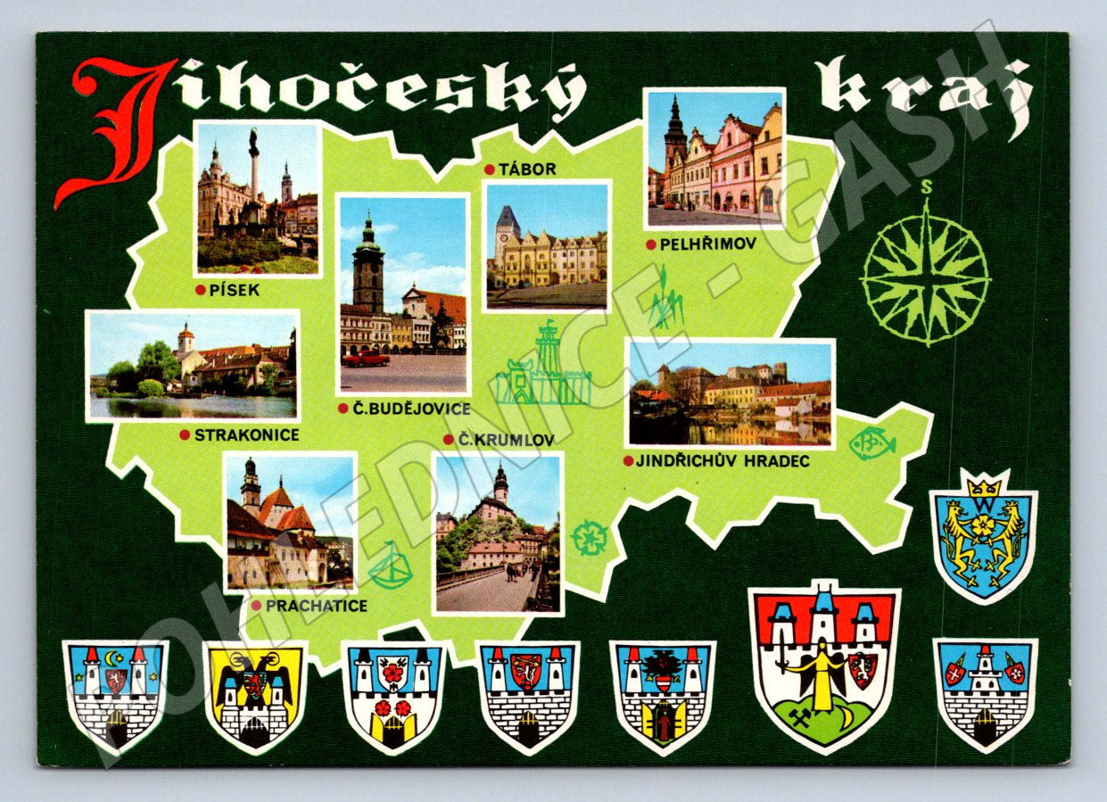 Originální pohlednice s motivem Jihočeského kraje na mapě a fotografiemi významných měst – Písek, Tábor, Pelhřimov, Strakonice, České Budějovice, Prachatice, Český Krumlov a Jindřichův Hradec. Pohlednice je tištěná, neprošlá poštou, ve velmi dobrém stavu, s drobnými známkami stáří. Na zadní straně je uvedeno Pozdrav z jižních Čech , výrobce Severografia Děčín a vydavatel Nakladatelství Praha. Součástí přední strany jsou městské erby a ilustrace památek. Vhodné pro sběratele historických pohlednic z Čech.