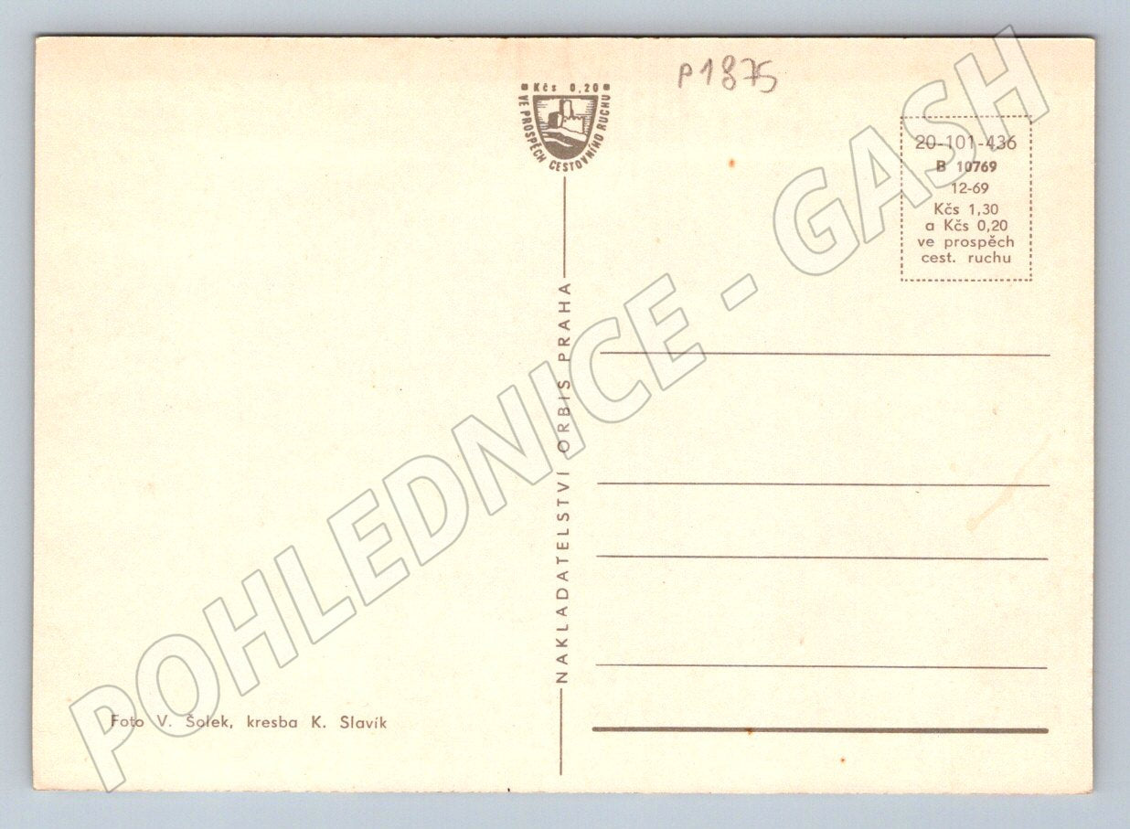 Starší pohlednice s motivem města Teplice. Na přední straně pohlednice je barevná koláž s mapou okolí Teplic a několika fotografiemi významných budov a parků. Nechybí nápis Pozdrav z Teplic a znak města s hlavou sv. Jana Křtitele. Zadní strana je nevyplněná, určena k běžnému poštovnímu použití a obsahuje informace o vydavateli (Orbis Praha, 1969) a autorech fotografie a kresby (V. Šolek, K. Slavík). Pohlednice je vhodná pro sběratele historických pohlednic, zájemce o Teplice nebo regionální témata. Stav pohlednice viz foto. Formát klasický malý.