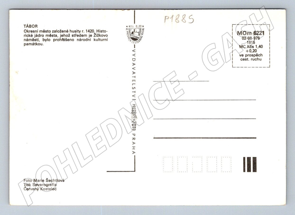 Pohlednice zobrazuje historické centrum města Tábor s dominantní radnicí na Žižkově náměstí. V levé části pohlednice je barevná fotografie náměstí s typickými renesančními domy a zaparkovanými vozy, v pravé části je orientační mapa centra města a okolních čtvrtí. Na zadní straně je krátký text o historii města Tábor, který připomíná jeho založení husity v roce 1420. Jádro města, jehož středem je právě zachycené náměstí, bylo prohlášeno národní kulturní památkou. Vydáno vydavatelstvím Pressfoto Praha, foto Marie Šechtlová. Stav odpovídá stáří, velmi dobrý sběratelský kousek.