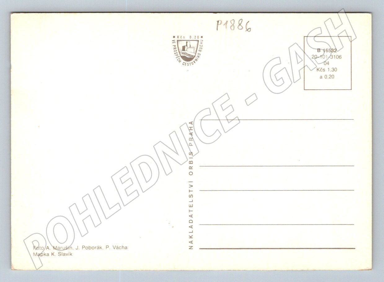 Barevná pohlednice z Liberce s několika ikonickými motivy města. Na pohlednici se nachází obrázek vysílače Ještěd, centrum města s radnicí, historická budova a orientační mapka okolí Liberce. Nechybí ani městský znak. Zadní strana je nepopsaná, připravena k odeslání, s místem pro známku i adresu. Vydavatelství Orbis Praha, autoři fotografie A. Marušin, J. Poborák, P. Vácha, mapka K. Slavík. Pohlednice je ve velmi dobrém stavu, zachovalé barvy i hrany. Sbírkový kousek vhodný pro milovníky Liberce nebo regionální historie.