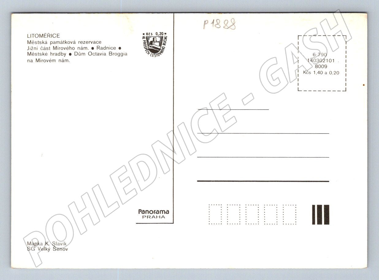 Barevná pohlednice města Litoměřice ve velkém formátu, vydaná po roce 1950. Na přední straně pohlednice je koláž fotografií významných městských památek – radnice, městské hradby, Dům Octavia Broggia a další části centra města. Součástí je i barevná mapa historického centra s vyznačením důležitých míst. Pohlednice je neprošlá a zachovalá, vhodná do sbírky pohlednic z ČR. Vydal Panorama Praha, mapku zpracoval K. Slavík, SG Velký Šenov. Vhodná pro sběratele pohlednic s historickou tematikou nebo milovníky regionální historie.