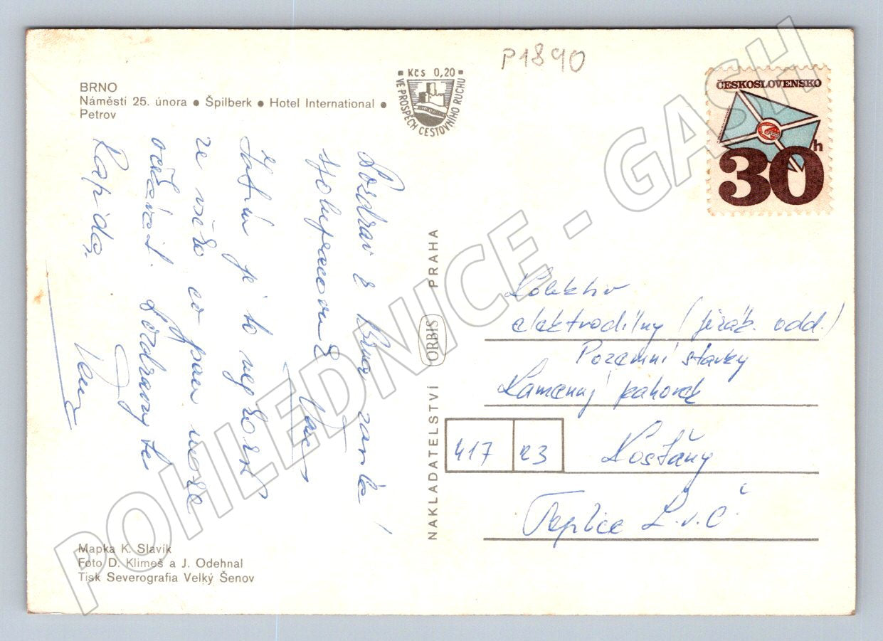 Originální pohlednice města Brna s barevnou koláží významných památek a mapou centra. Na přední straně najdeme záběry na kašnu Parnas, hrad Špilberk, Hotel International a katedrálu sv. Petra a Pavla. Pohlednice je doplněna znakem města Brna a mapkou centra. Zadní strana je vyplněná ručně psaným vzkazem, opatřená známkou a poštovním razítkem z období Československa. Ideální sběratelský kousek pro milovníky historie Brna a starých pohlednic. Stav dle fotografií, známky drobného opotřebení.