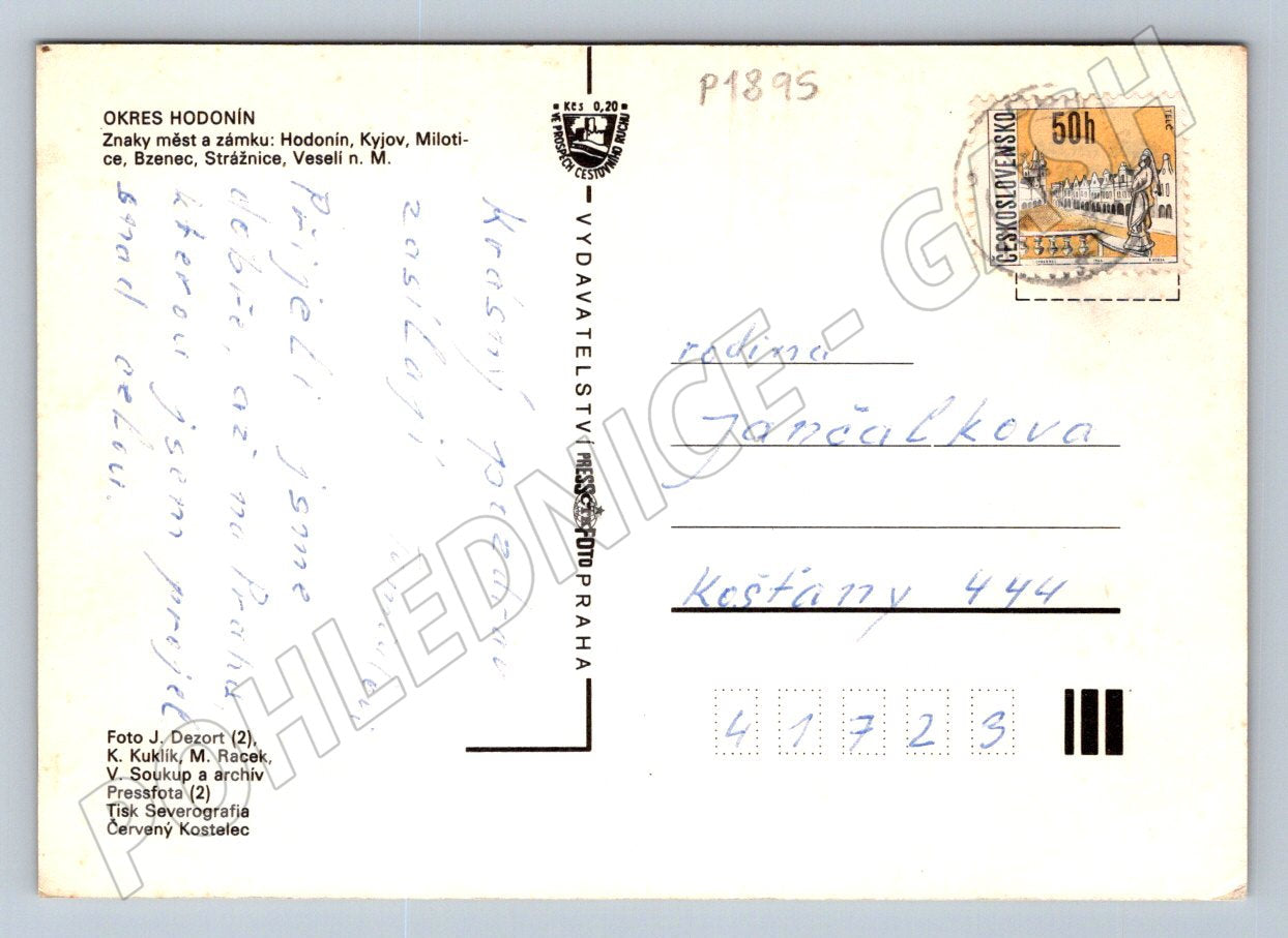 Originální pohlednice s motivem regionu Hodonínsko v Jihomoravském kraji, zobrazující koláž fotografií ze známých míst, jako jsou Hodonín, Kyjov, Milotice, Bzenec, Strážnice, Velkomoravské Mikulčice a Veselí nad Moravou. Na pohlednici jsou také zobrazeny znaky jednotlivých měst a mapa s vyznačením lokality. Pohlednice byla zaslána poštou, má známku ČSSR a krátký psaný vzkaz adresovaný rodině Janáčkově. Výborný sběratelský kousek pro milovníky jižní Moravy a historických pohlednic.
