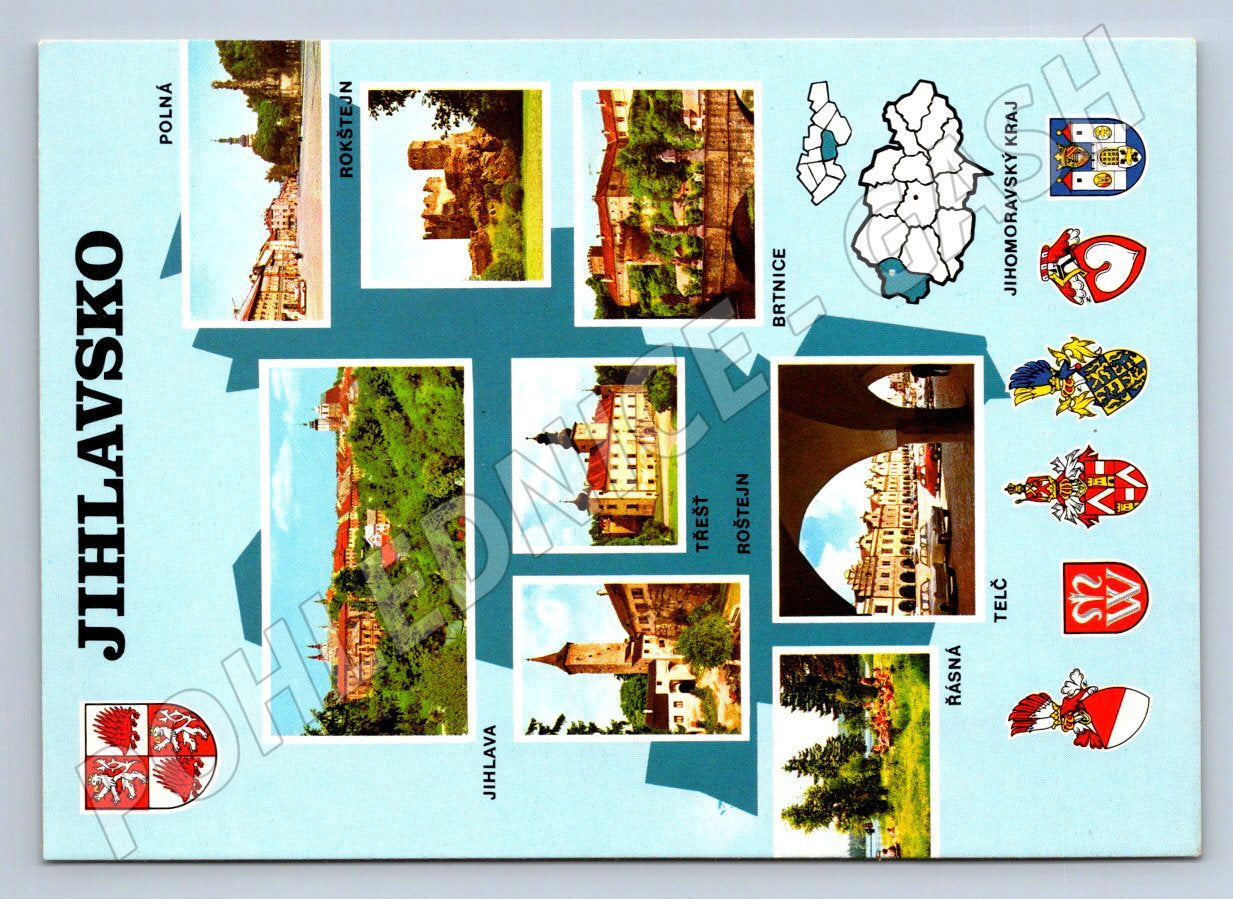 Nabízím originální pohlednici s motivy okresu Jihlava (Jihlavsko), která zobrazuje významné památky a města této oblasti, jako jsou Jihlava, Telč, Polná, Třešť, Brtnice, Roštejn, Rájská a další. Pohlednice zachycuje krásu kulturních i přírodních pamětihodností, které jsou zde k vidění, a představuje znaky měst a znak okresu. Zadní strana je čistá, s krátkým popisem hlavních turistických atrakcí regionu. Pohlednice je ve velmi dobrém stavu, vhodná pro sběratele nebo pro potěšení z krás české krajiny a architektury. Rozměry odpovídají malému formátu. Vydal Severografia Děčín.