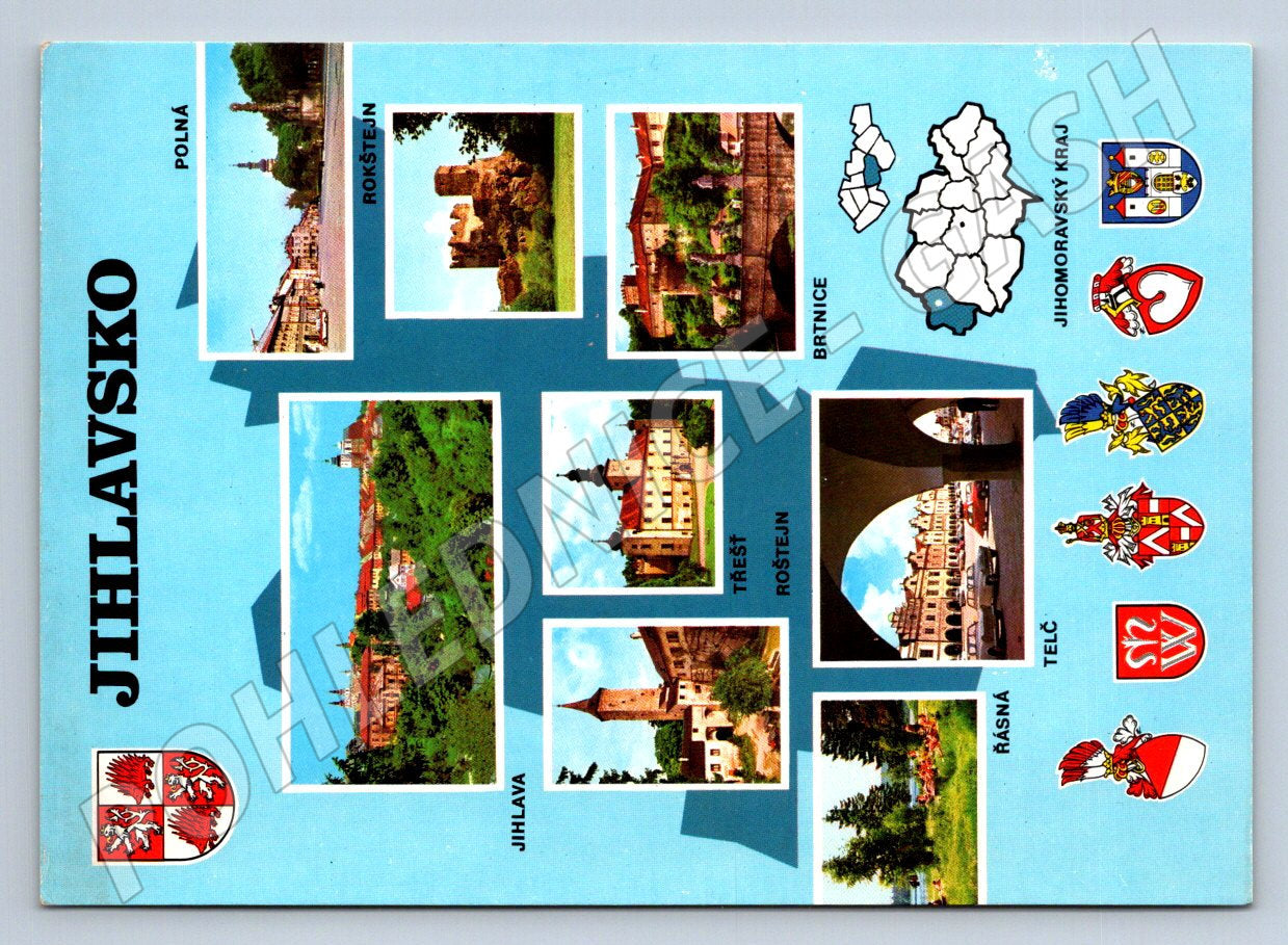Pohlednice Jihlavsko představuje výběr významných historických památek a měst regionu Jihlava. Na barevné koláži najdete fotografie a znaky měst Jihlava, Telč, Polná, Brtnice, Třešť, Rokštejn, Roštejn a Rázná. Významnou část tvoří zobrazení zdejších hradů a zámků (Telč, Roštejn, Polná aj.). Pohlednice zachycuje atmosféru Vysočiny v druhé polovině 20. století a je sběratelsky zajímavá zejména díky kombinaci fotografií, znaků jednotlivých měst a mapky okresu Jihlava. Na zadní straně jsou údaje o autorech fotografií a tisku, místo pro známku i text. Vhodná do sbírky pohlednic s tematikou českých hradů, zámků a regionů.