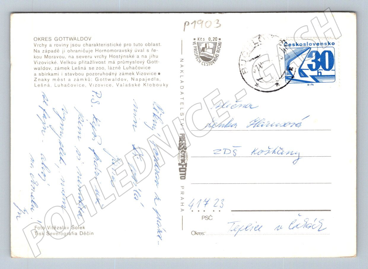 Originální pohlednice z oblasti Gottwaldovska (dnes Zlínský kraj), zachycující významná města a pamětihodnosti regionu – Gottwaldov (Zlín), Lešná, Otrokovice, Napajedla, Luhačovice, Valašské Klobouky a Vizovice. Na přední straně jsou barevné fotografie typických staveb, lázní i zámků a erby měst. Na zadní straně je text o charakteristice okresu Gottwaldov a ručně psaná zpráva s poštovní známkou Československa. Skvělý sběratelský kousek nebo nostalgický dárek, dokumentující atmosféru 70.–80. let minulého století. Stav viz foto.
