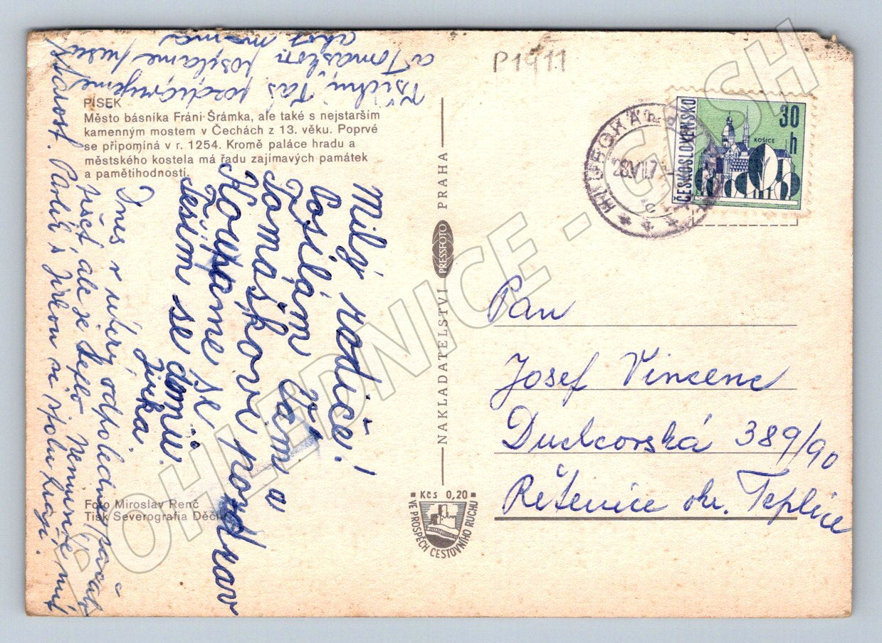 Originální starší pohlednice města Písek s barevným kolážovým zobrazením několika významných památek a míst ve městě, včetně historického kamenného mostu, městské radnice, městského divadla a dalších dominant. Pohlednice byla odeslána, na zadní straně je ručně psaný text, adresa i dobová poštovní známka. Zajímavá sběratelská položka pro milovníky české historie, architektury i regionu jižních Čech. Z pohlednice dýchá dobová atmosféra a je krásným dokladem minulosti města Písek, které je známé svou kulturou, tradicemi i historickými stavbami. Pohlednice nese mírné známky stáří a opotřebení na okrajích.