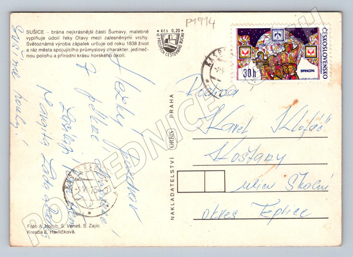 Pohlednice města Sušice – braná jedné z nejkrásnějších částí Šumavy. Na přední straně jsou čtyři fotografie – panoramatický pohled na město, historická architektura, náměstí s radnicí a rozhledna. Na rubu je popis města Sušice a ručně psaná korespondence s originální známkou ČSSR (30 h, motiv BRNO 74). Pohlednice je adresována, opatřena razítkem a nese dobovou patinu. Ideální pro sběratele historických pohlednic z Čech a milovníky regionálních pamětihodností. Stav viz foto.