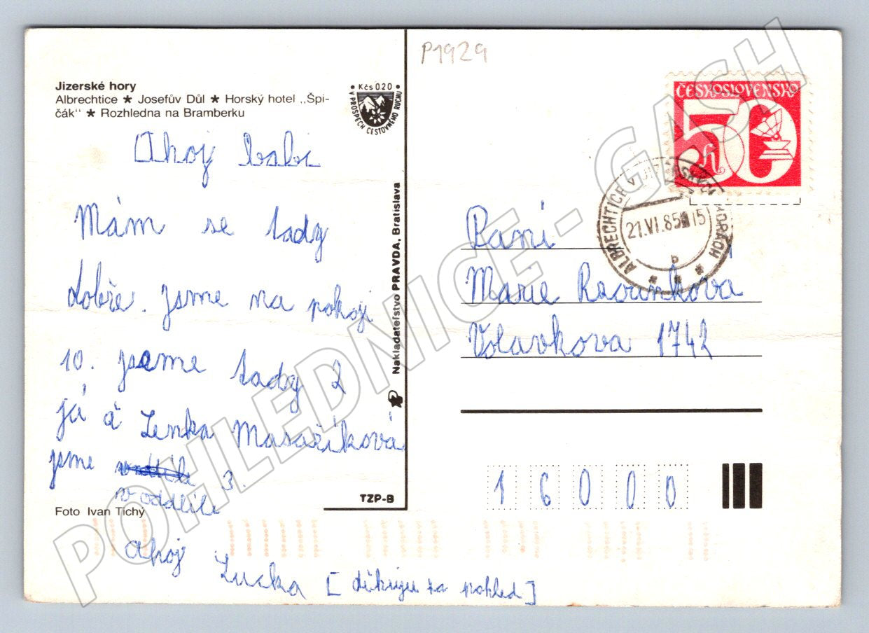 Originální pohlednice s motivem Jizerských hor, na které jsou vyobrazeny známé lokality, včetně rozhledny na Bramberku a horského hotelu Špičák. Na přední straně najdete barevné fotografie z krásné přírody této oblasti. Pohlednice byla odeslaná v roce 1985, což potvrzuje poštovní razítko i dobová známka Československa s hodnotou 50 haléřů. Na zadní straně je ručně psaný pozdrav. Stav pohlednice odpovídá stáří – rohy jsou mírně ohnuté, na přední straně je patrný lom. Pohlednice je vhodná pro sběratele historických pohledů z ČR i milovníky Jizerských hor.