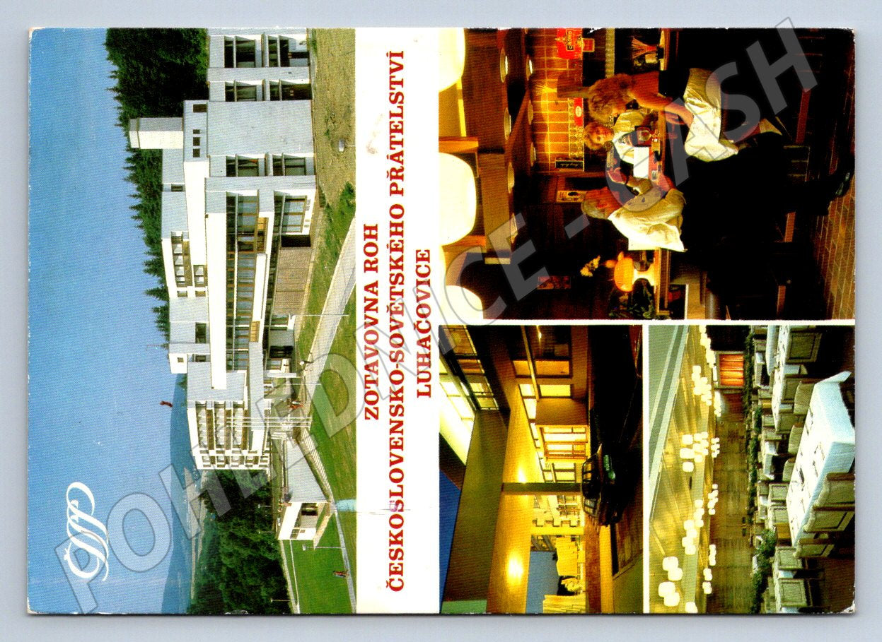 Originální pohlednice ze zotavovny ROH Česko-sovětského přátelství v Luhačovicích. Pohlednice zachycuje moderní architekturu zotavovny, interiéry restaurací a společenských prostor. Jedná se o vydařený kousek z počátku 90. let, odeslaný v roce 1990 s autentickou známkou a razítkem. Na zadní straně je ručně psané věnování a adresa. Pohlednice je vhodná pro sběratele pohlednic z ČR, zájemce o architekturu nebo milovníky historie socialistických rekreačních zařízení. Stav odpovídá stáří, menší známky opotřebení.