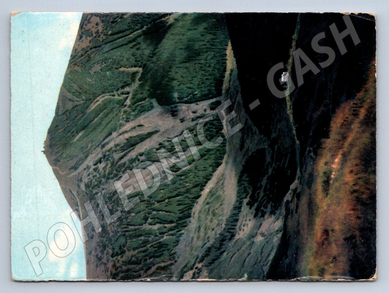 Originální historická pohlednice menšího formátu zachycující horský masiv se zelenými svahy. Pohlednice pochází z období do roku 1950 a nese znaky stáří, včetně lehkého opotřebení na okrajích a mírného poškození rohů. Zadní strana je nepopsaná, bez poštovního razítka či známky, pouze s ručně napsaným číslem a poznámkou. Skvělý sběratelský kus pro milovníky české přírody či sběratele starých pohlednic.