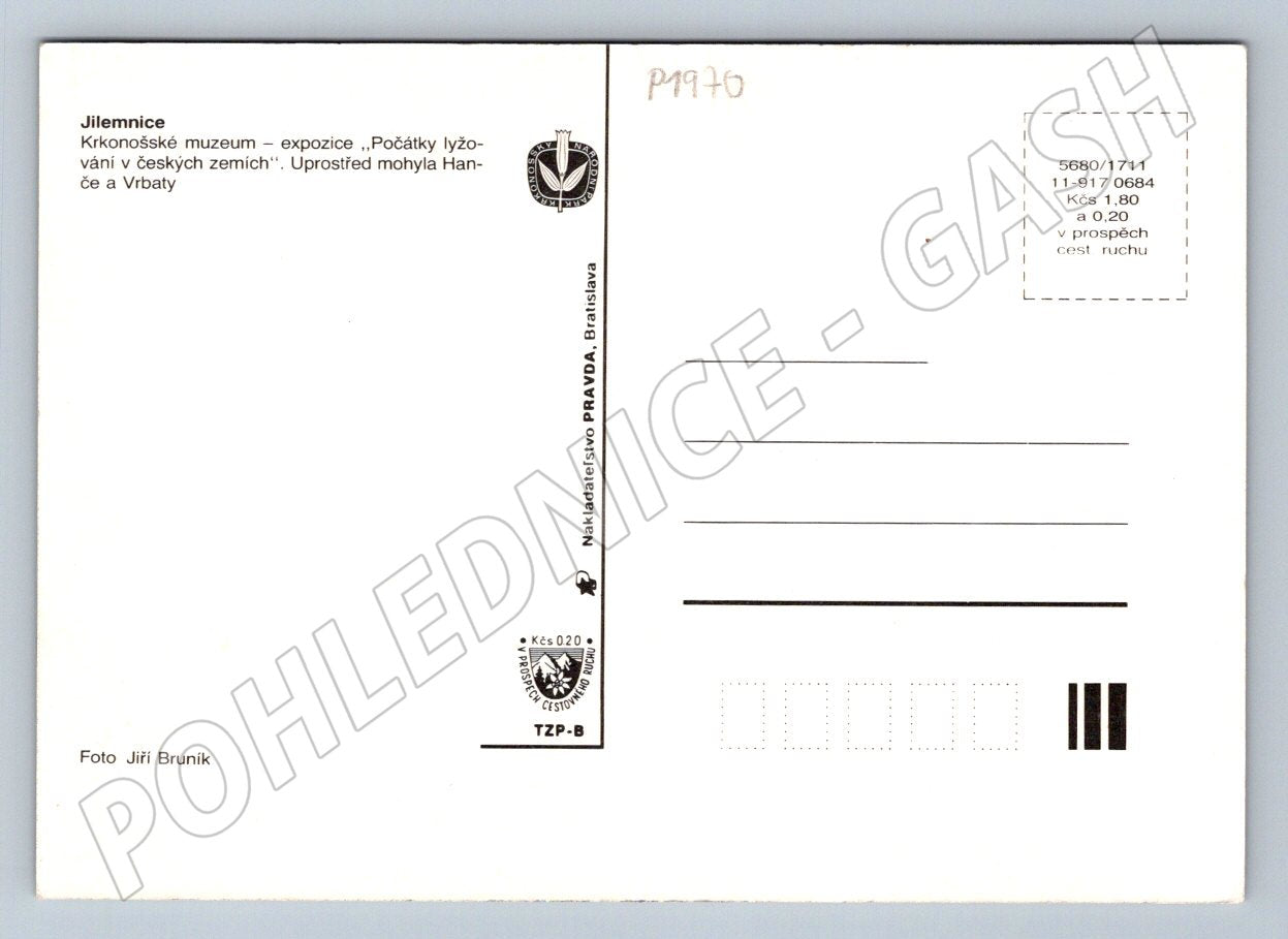 Pohlednice s motivem expozice Krkonošského muzea v Jilemnici, zaměřené na počátky lyžování v českých zemích. Na přední straně jsou záběry z muzejních expozic, kde lze vidět historické lyže, exponáty a informační panely. Uprostřed pohlednice je fotografie mohyly Hanče a Vrbaty na hřebenech Krkonoš při západu slunce. Zadní strana obsahuje krátký popis expozice muzeu. Pohlednice je tištěná nakladatelstvím Pravda, Bratislava. Vhodná pro sběratele, milovníky historie českého lyžování i Krkonoš.