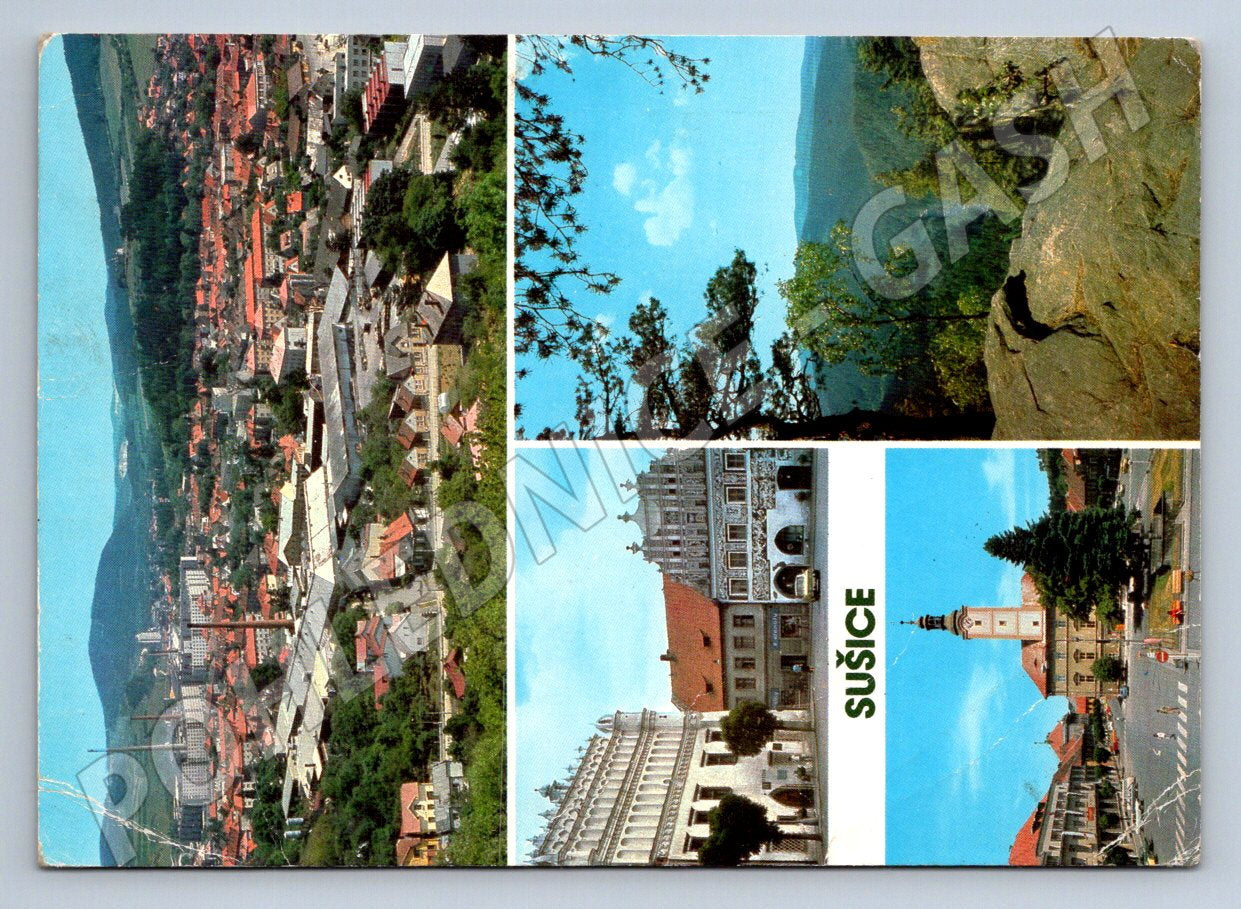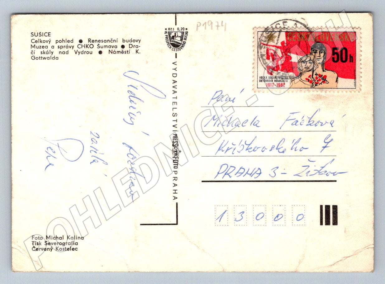 Originální víceobrázková pohlednice Sušice, která zachycuje panoramatický pohled na město, renesanční budovy, muzea, správu CHKO Šumava, Drač skály nad Vydrou a náměstí K. Gottwalda. Pohlednice byla zaslána v době Československa a je na ní patrné dobové razítko a známka s motivem 65. výročí Velké říjnové socialistické revoluce. Text i adresa jsou ručně psané. Pohlednice je v zachovalém stavu, vhodná pro sběratele historických pohlednic z ČR nebo regionu Šumava.