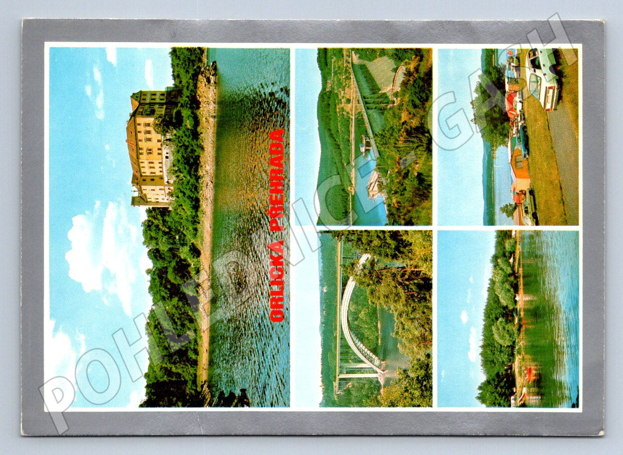 Originální pohlednice s motivem Orlické přehrady a státního zámku Orlík. Na přední straně naleznete několik fotografií z okolí přehradní hráze, zámku Orlík, Žďákovského mostu a autokempinků Radava a Velký Vir. Pohlednice pochází z období Československa (rok 1983) a je ve velmi slušném stavu, bez popsání a s drobnými známkami stáří. Zajímavý sběratelský kousek dokumentující významnou památku a vodní dílo v České republice.