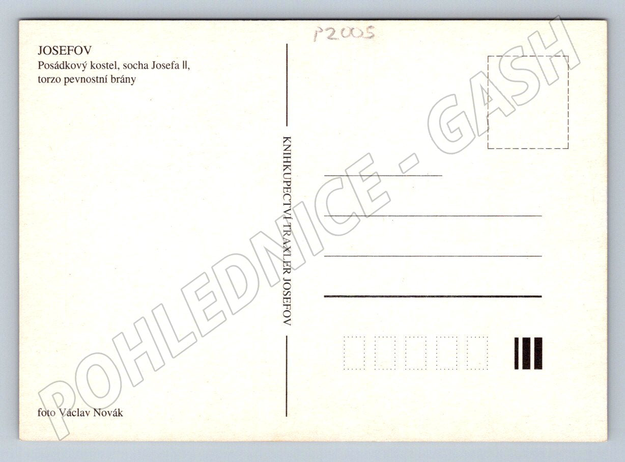 Pohlednice zobrazuje významné pamětihodnosti města Josefov, včetně posádkového kostela, sochy Josefa II. a torza pevnostní brány. Na přední straně je více fotografií s detailním pohledem na historické stavby a pomník, doplněné popisem a emblémem pevnosti Josefov. Pohlednice je neprošlá, bez zápisu i známky, v pěkném sběratelském stavu. Autor fotografie: Václav Novák. Publikace: Knihkupectví Traxler, Josefov. Skvělý doplněk do sbírky pohlednic s tematikou českých měst a památek.