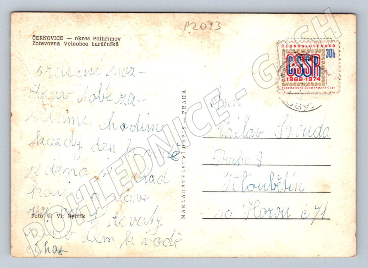 Originální černobílá pohlednice zachycující zotavovnu Veleobce baráčníků v Černovicích, okres Pelhřimov. Na přední straně je zobrazená budova zotavovny spolu s návštěvníky a dětmi v popředí. Zadní strana je popsána perem, s poštovní známkou z období ČSSR (1969–1974) a originálním razítkem. Pohlednice je ve velmi dobrém sběratelském stavu, pouze lehké známky stáří. Skvělý přírůstek do sbírky historických pohlednic z Čech, vhodná pro sběratele i zájemce o regionální historii.
