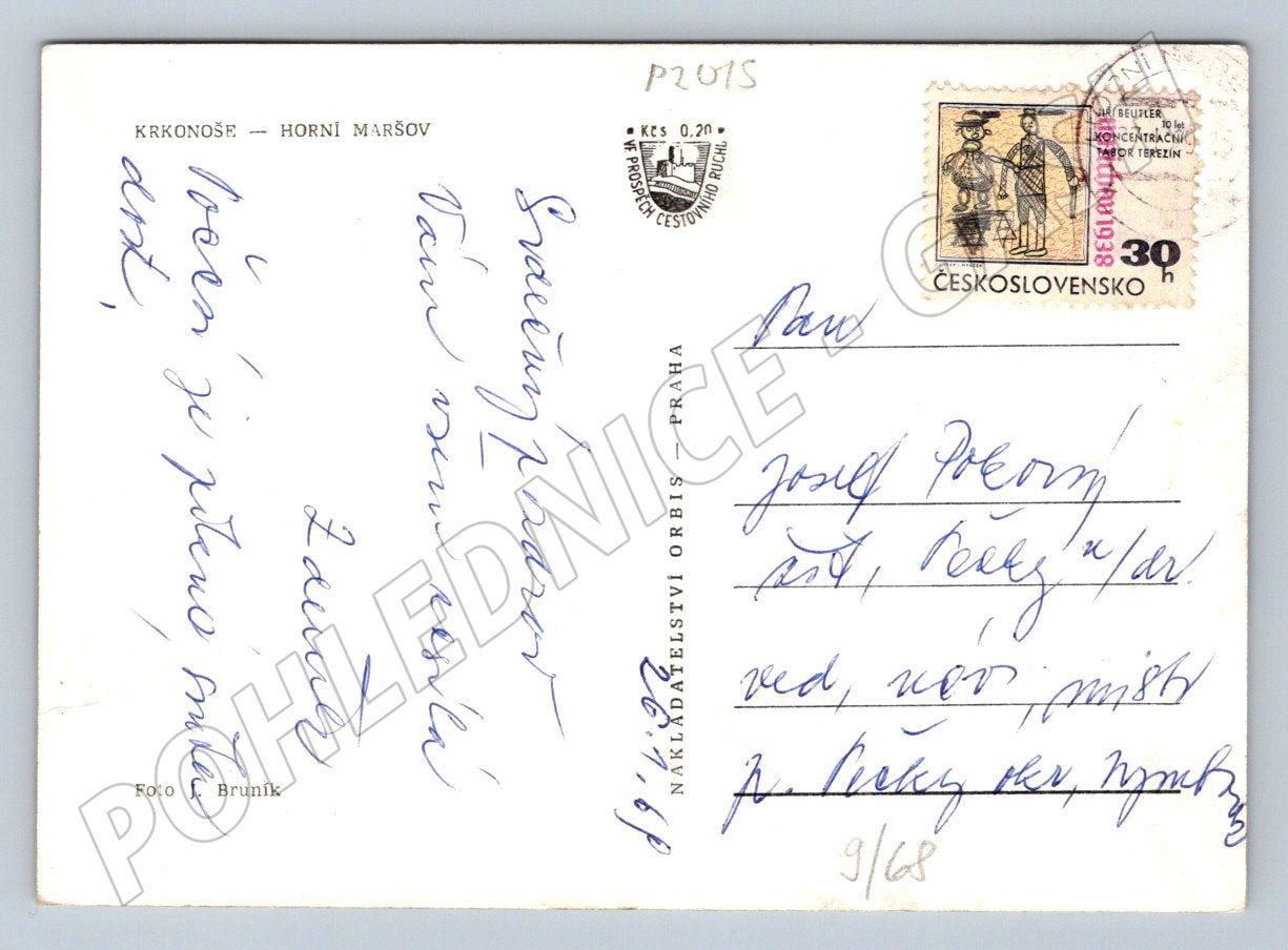 Originální historická černobílá pohlednice z oblasti Krkonoš, konkrétně Horní Maršov. Pohlednice zachycuje zimní krajinu s běžkaři, typickou horskou architekturu a zasněžené lesy v pozadí. Na zadní straně je poštovní známka, razítko a ručně psaný vzkaz z období Československa, vznik pohlednice lze odhadnout na přelom 40. a 50. let 20. století. Tato pohlednice je vhodná pro sběratele historických pohlednic nebo milovníky českých hor a historie. Stav odpovídá stáří, pohlednice byla odeslána a psána.