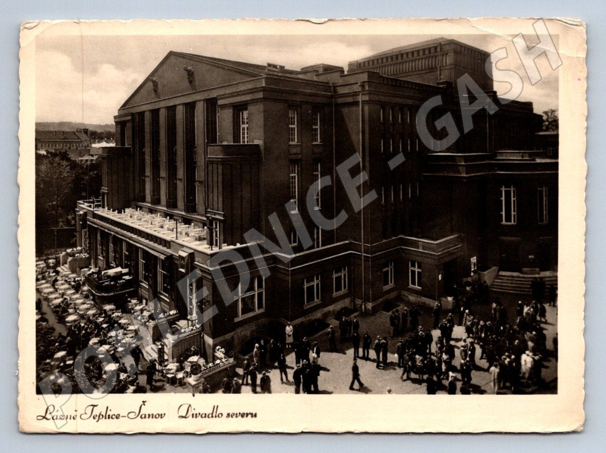 Originální historická pohlednice s motivem Divadla severu v Lázních Teplice-Šanov. Na černobílé fotografii je zachycena modernistická budova divadla obklopená lidmi a venkovní kavárnou, což evokuje atmosféru kulturního života první poloviny 20. století. Pohlednice není použita, na zadní straně je pouze velmi lehké označení číslem. Hrany mírně opotřebované odpovídající stáří. Skvělý sběratelský kus s regionální tematikou a výborným stavem zachování.