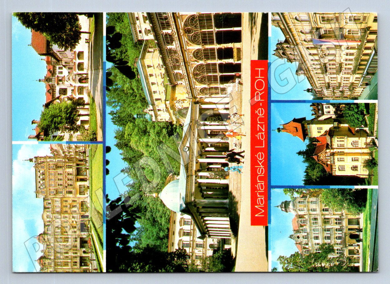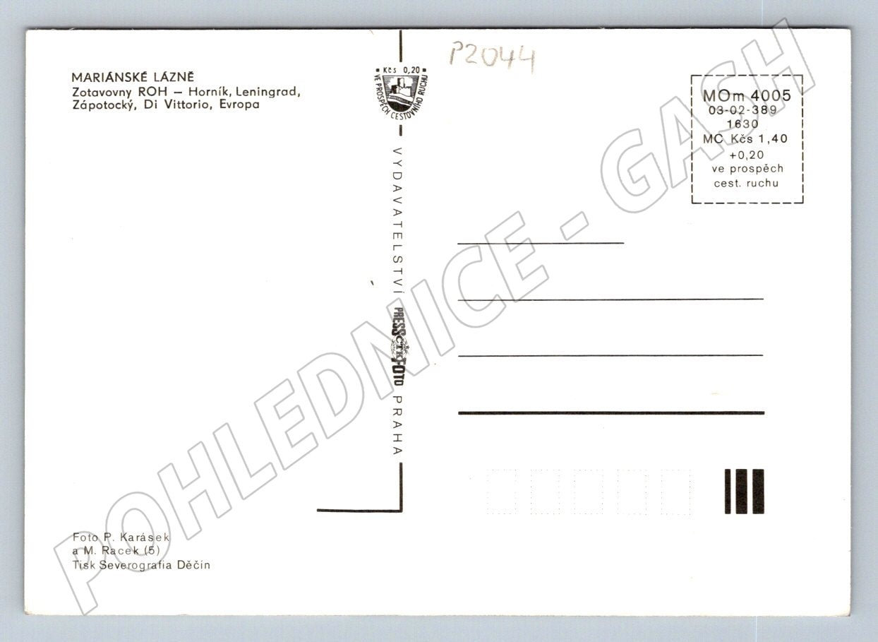 Barevná pohlednice Mariánských Lázní, konkrétně zotavoven ROH (Revoluční odborové hnutí). Na lícové straně je několik fotografií významných budov lázeňského města. Na zadní straně jsou informace o budovách: Horník, Leningrad, Zápotocký, Di Vittorio, Evropa. Vydáno vydavatelstvím Pressfoto Praha, fotografie P. Karásek a M. Racek, tisk Severografia Děčín. Pohlednice je v pěkném stavu, vhodná do sbírky nebo pro milovníky českých lázeňských měst.