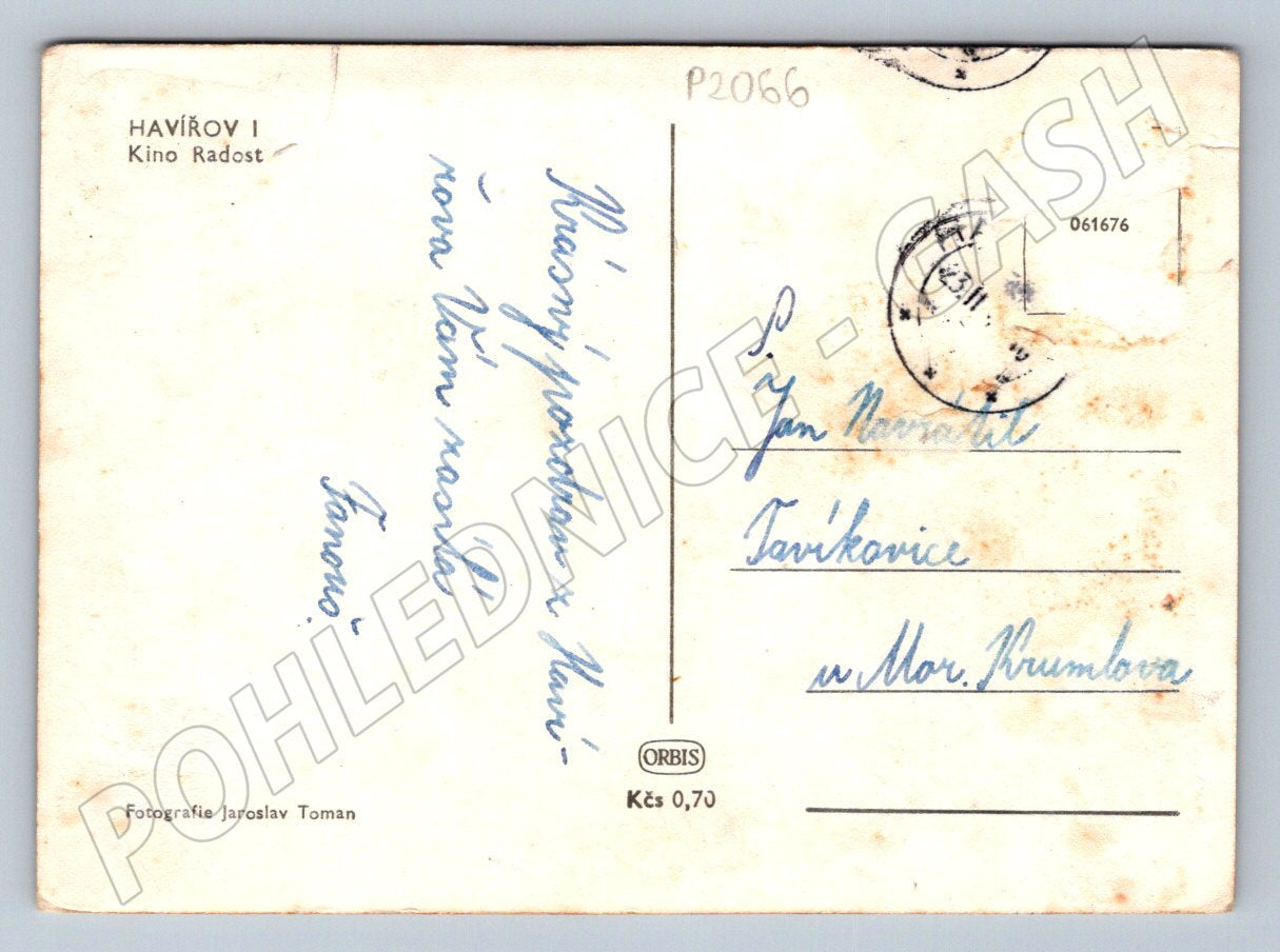 Nabízím originální pohlednici ze sbírky, zachycující budovu Kina Radost v Havířově. Pohlednice nese známky času a užívání, včetně ručně psaného pozdravu a poštovního razítka. Na zadní straně je zřetelný rukopis adresáta i odesílatele. Fotografie na přední straně je dílem Jaroslava Tomana. Pohlednice je vhodná pro sběratele, milovníky památek, architektury 20. století nebo zájemce o historii města Havířov. Velmi pěkný stav odpovídající stáří, pohled zasílán v původním oběhu. Skvělý doplněk do sbírky českých pohlednic z období před rokem 1950.