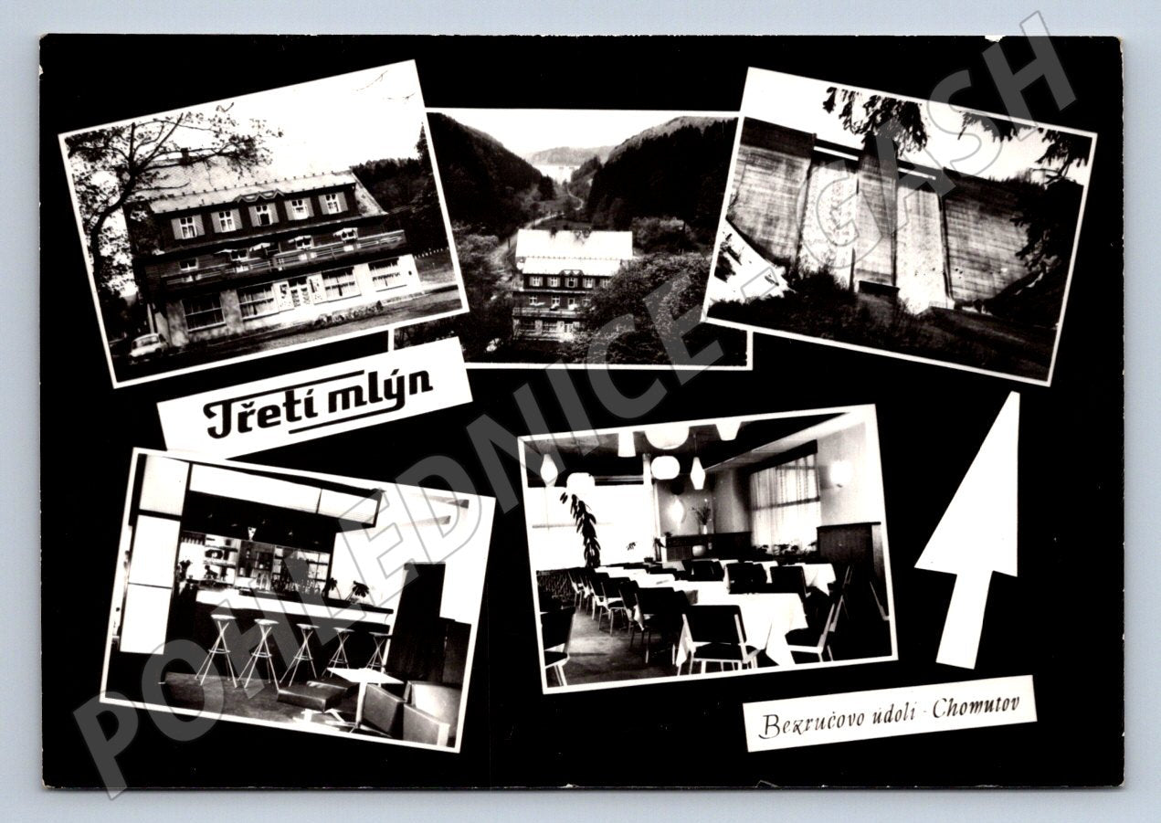 Originální pohlednice s více fotografiemi objektu Třetí mlýn v Bezručově údolí u Chomutova. Na pohlednici jsou zobrazeny exteriéry i interiéry mlýna a také okolní krajina. Na zadní straně je prostor pro známku a adresu, s předtiskem 1,30 Kčs. Skvělý sběratelský kousek pro zájemce o regionální historii nebo pohlednice českých mlýnů a turistických míst. Pohlednice je v zachovalém stavu, bez zápisu, pouze ručně vepsaný nápis v horním rohu.