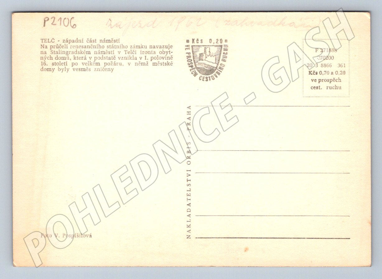 Originální černobílá pohlednice znázorňující západní část náměstí v Telči s renesančními městskými domy. Nápis na zadní straně upřesňuje, že pohlednice zachycuje průčelí renesančního státního zámku navazující na náměstí a informace o vzniku domů po požáru v 16. století. Na fotografii je kromě historických budov a podloubí zachycen i dobový automobil a chodci, což dokresluje atmosféru doby. Vydáno nakladatelstvím Orbis Praha, foto V. Pospíšilová. Pohlednice je neprošlá poštou, ve velmi dobrém stavu, vhodná pro sběratele či milovníky české historie a architektury. Rozměr pohlednice odpovídá klasickému malému formátu. Skvělý sběratelský kousek z období cca 1950-1960.