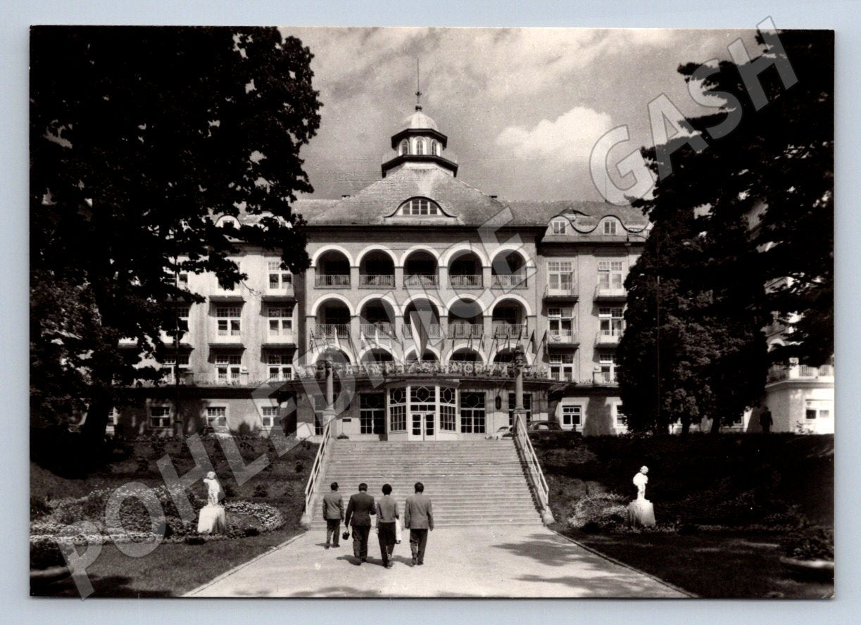 Originální černobílá pohlednice zachycující Priessnitzův léčebný ústav v Jeseníku. Na přední straně je zobrazen impozantní vstupní areál s hlavní budovou a upraveným okolím, kde jsou patrní lidé v dobovém oblečení. Na zadní straně naleznete text v několika jazycích, razítko a známku z období Československa v hodnotě 30 haléřů. Pohlednice byla zaslána poštou, je opatřena ručně psaným vzkazem a adresou adresáta. Vhodné pro sběratele historických pohlednic a zájemce o lázeňství či historii Jeseníku.