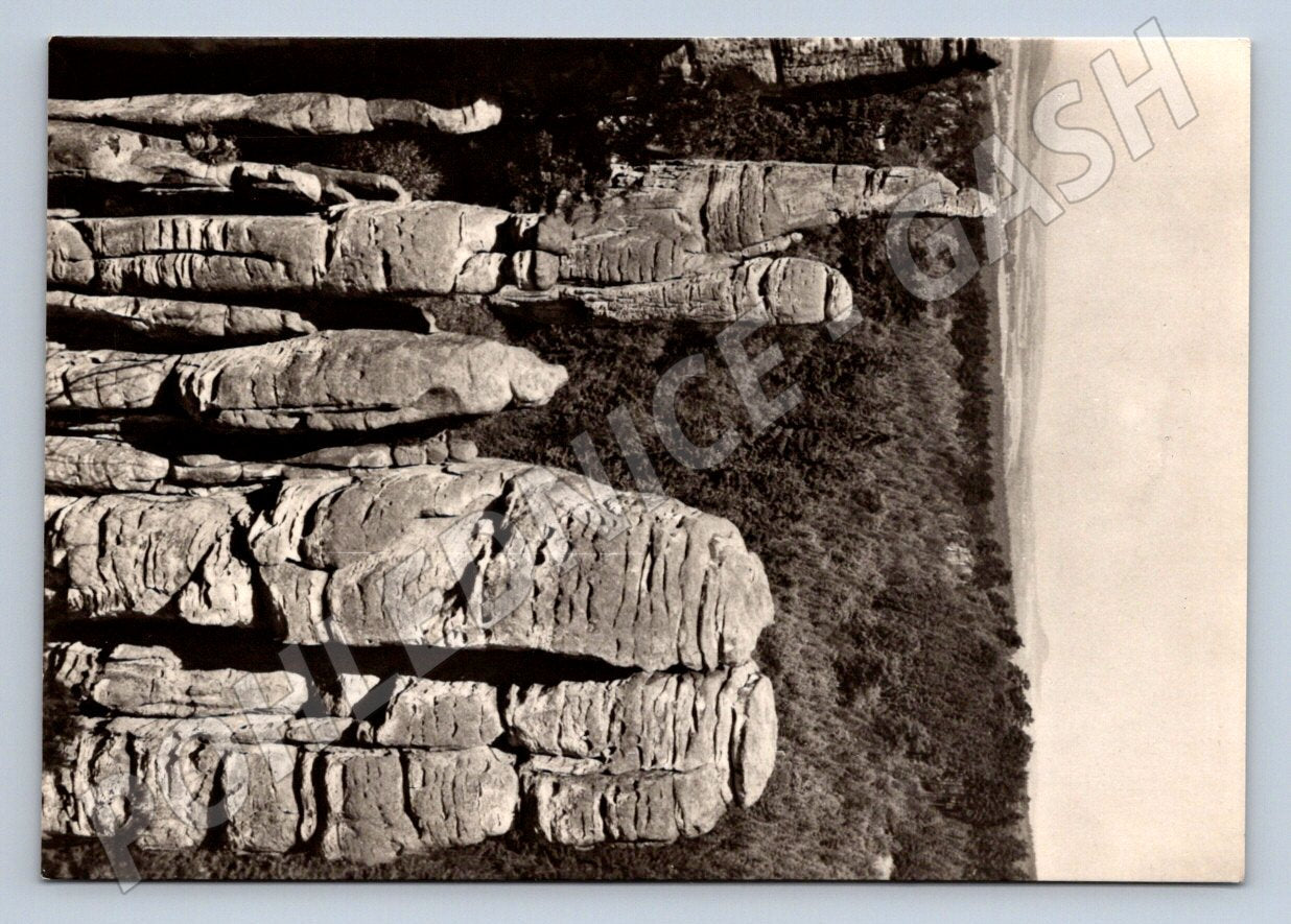 Originální černobílá pohlednice zobrazující Prachovské skály v Českém ráji. Snímek zachycuje vyhlídku s výhledem na sousední skalní útvary. V popředí jsou zleva Matka s děťátkem, Beránek a rozštěpený hranol Krakonoš, za nimi dvojvěží Prachovská jehla a Čapka. Pohlednice nese známky stáří, ale je ve velmi dobrém stavu. Zadní strana je čistá, připravena k odeslání nebo ke sběratelským účelům. Fotografii pořídil J. Hajfler. Vydal Orbis Praha.