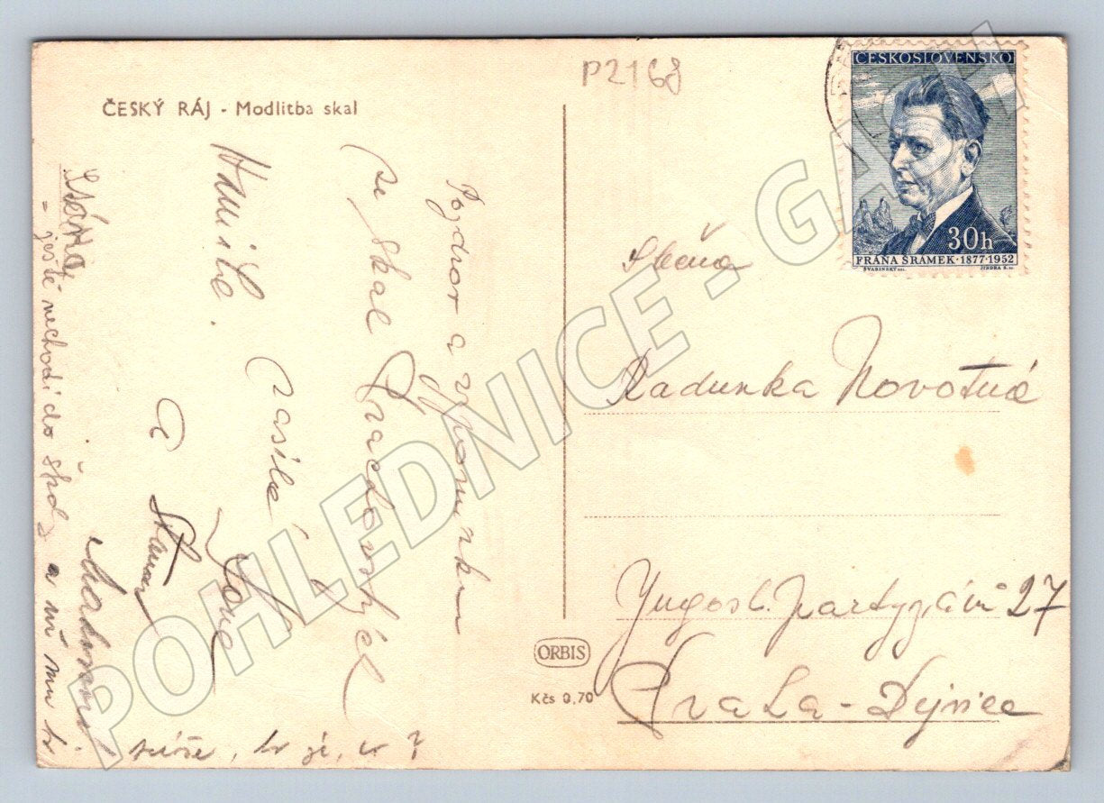 Originální stará pohlednice z oblasti Český ráj – Modlitba skal. Na přední straně je černobílá fotografie známé pískovcové skály v Českém ráji. Zadní strana nese rukopisné věnování a starou známku s portrétem Františka Srámka. Pohlednice byla odeslána v období první poloviny 20. století, což z ní činí zajímavý sběratelský kousek i s historickou hodnotou. Stav pohlednice odpovídá stáří, rohy jsou mírně otřepené, rukopis čitelný. Autentický dobový dokument české přírody a tradice zasílání pozdravů.