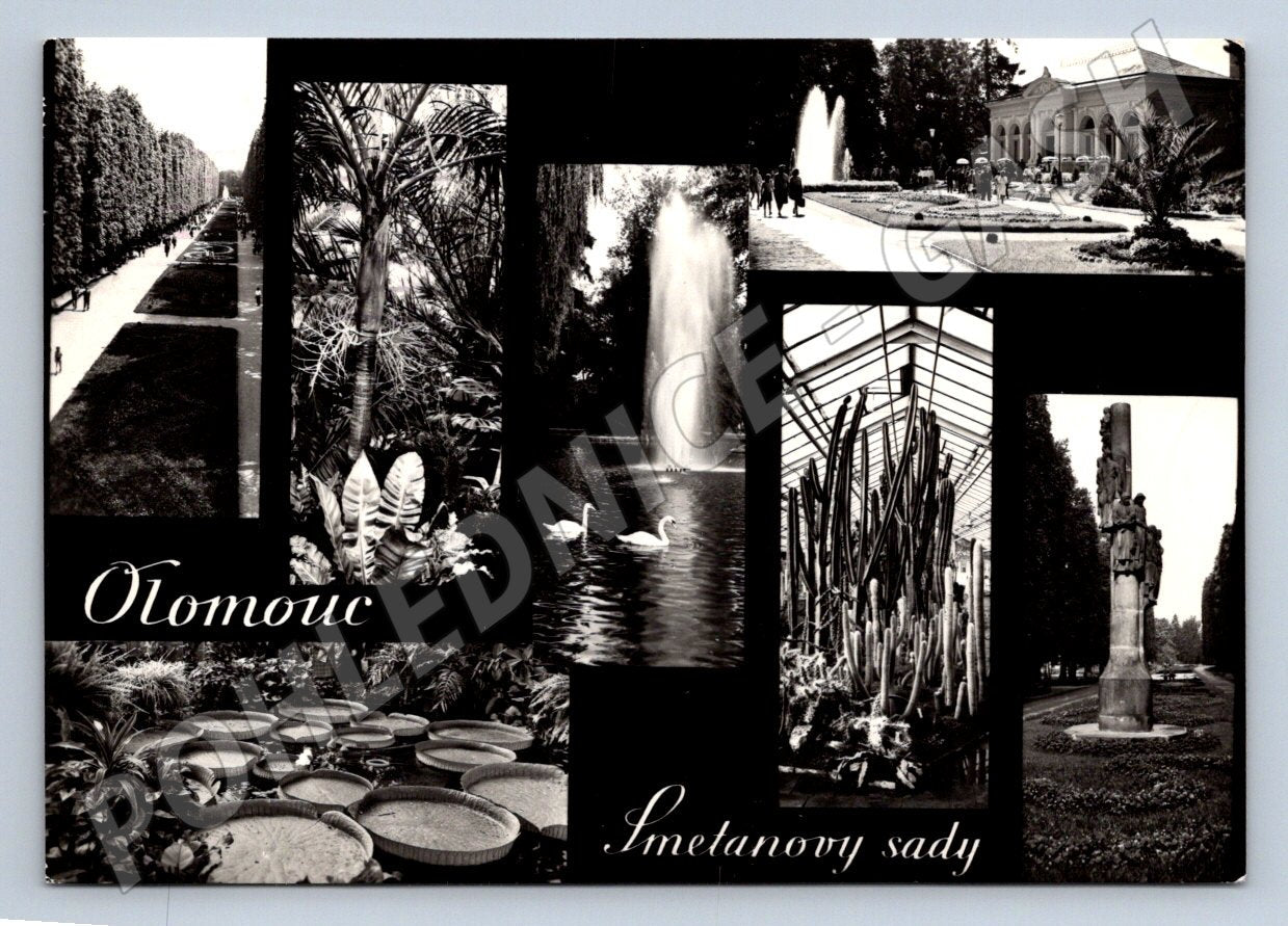 Originální pohlednice s motivem Smetanových sadů v Olomouci. Černobílá koláž významných míst a zákoutí oblíbeného městského parku – fontána, exotické rostliny ve skleníku, zahradní architektura a sochy. Na pohlednici je ručně psané věnování, používána, opatřena dobovou známkou a poštovním razítkem s datací (Flora 67). Výborný sběratelský stav, vhodná do sbírky regionálních pohlednic nebo historických suvenýrů Olomouce. Rozměr klasického malého formátu, obě strany jsou dobře čitelné.