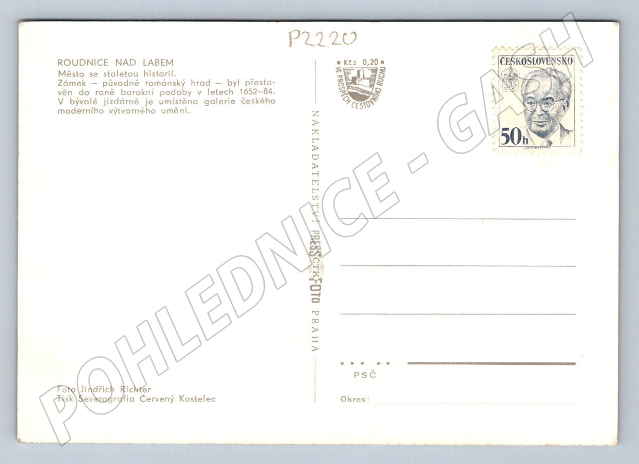 Pohlednice s motivem města Roudnice nad Labem. Na přední straně jsou umístěny čtyři fotografie představující významné pamětihodnosti města – pohled na zámek, náměstí, galerii v bývalé jízdárně a pohled přes řeku Labe. Na zadní straně je stručný popis historie města a zámku, včetně informace o galerii českého moderního umění. Pohlednice byla vydána v době Československa, je opatřena poštovní známkou a razítkem. Ideální sběratelský kousek s krásným historickým zpracováním a zachycením architektury.