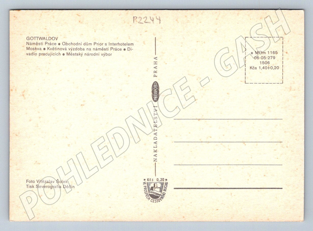 Barevná pohlednice města Gottwaldov (dnes Zlín) s kolážemi hlavních městských dominant. Na přední straně jsou vyobrazeny významné budovy a místa města, jako je Náměstí Práce, obchodní dům Prior, kulturní dům, divadlo a městský národní výbor. Pohlednice nese známky doby vydání – před rokem 1990, kdy město neslo název podle Klementa Gottwalda. Zadní strana je nepopsaná, s předtištěnou sazbou a místem pro známku. Graficky atraktivní historický artefakt sběratelského charakteru, vhodný pro sběratele socialistických pohlednic i příznivce historie Zlínska.