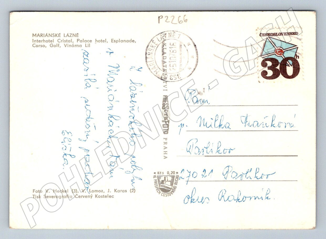 Originální pohlednice Mariánské Lázně – více pohledů na významné hotely a lázeňské budovy. Na přední straně jsou barevné fotografie hotelů jako Cristal, Palace, Esplanade, Corso či Golf v klasickém kolážovém stylu. Na zadní straně známka ČSSR a ručně psaný vzkaz. Vhodné pro sběratele pohlednic, zájemce o historii českých lázní nebo milovníky retro korespondence. Výborný stav, jasné barvy, kompletní, známka i razítko součástí!