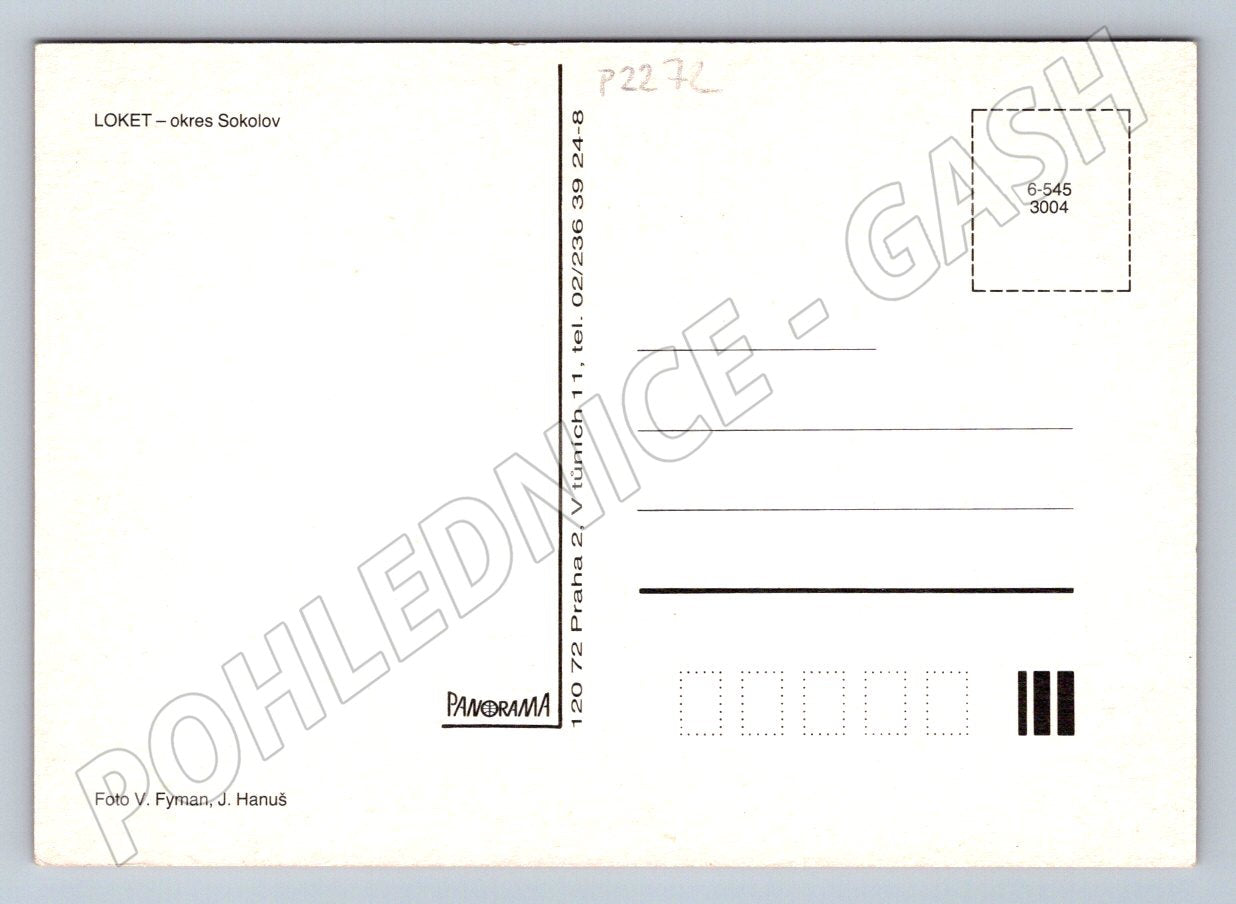 Barevná pohlednice města Loket v okrese Sokolov. Na přední straně je několik fotografií zachycujících dominanty města, včetně hradu Loket, historických měšťanských domů, náměstí a okolní přírody. Pohlednice zobrazuje turisticky atraktivní lokality i místní koupaliště. Zadní strana je nepopsaná, připravená k odeslání. Vydavatel: Panorama. Autor fotografie: V. Fyman, J. Hanuš. Typický sběratelský suvenýr z období druhé poloviny 20. století.