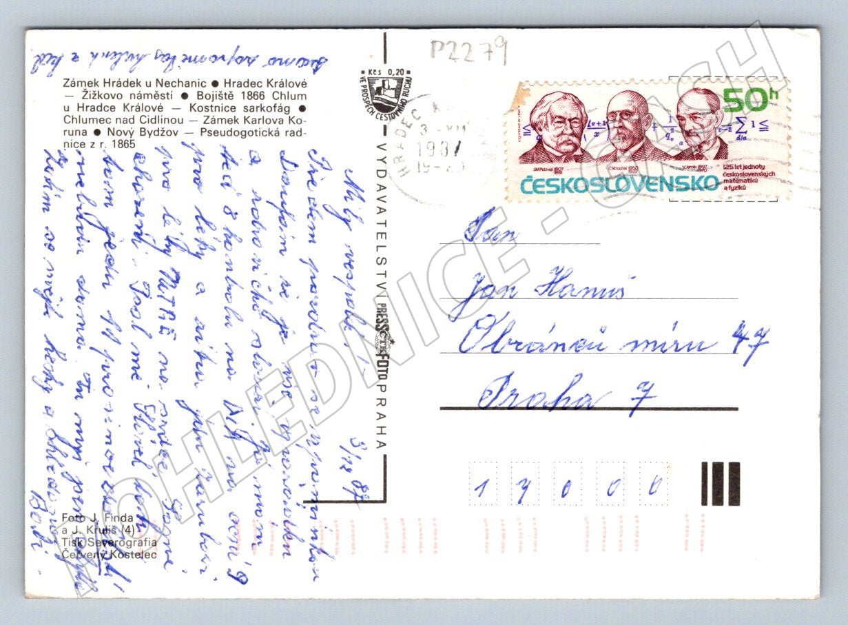 Originální pohlednice Královéhradecka s více fotografiemi významných památek tohoto kraje, včetně zámku Hrádek u Nechanic, Žižkova náměstí, kostnice sarkofágu, a dalších. Pohlednice byla zaslána z Československa a je opatřena známkou k 125. výročí československých matematiků. Na zadní straně je vlastnoručně psaný text a adresa. Ideální pro sběratele historických pohlednic i milovníky regionální historie. Pohlednice je ve velmi dobrém stavu, pouze mírné opotřebení rohů. Formát malý, klasický typ československých pohlednic z 2. poloviny 20. století.