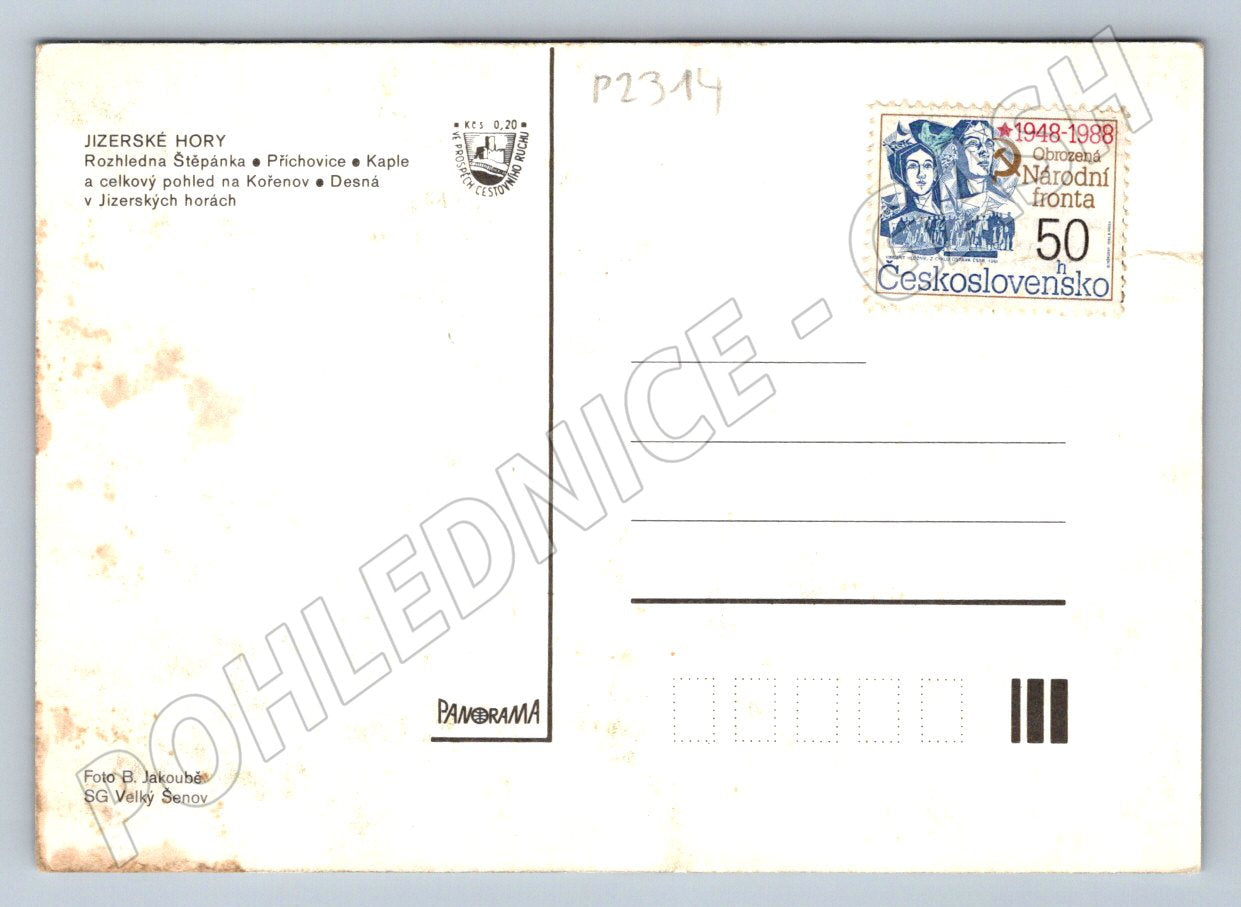 Originální pohlednice Jizerské hory zachycující malebné zimní scenérie a monumenty tohoto kraje. Na pohlednici jsou vyobrazeny významné stavby jako rozhledna Štěpánka, kaple či celkový pohled na Kořenov a Desnou. Zadní strana pohlednice je opatřena známkou ČSSR z roku 1988 a obsahuje popis lokalit v češtině. Pohlednice má typické stáří a patinu, je vhodná pro sběratele a milovníky historických pohlednic z oblasti Jizerských hor. Autor fotografie B. Jakoubě, vydavatel SG Velký Šenov. Výjimečný kousek pro sbírku!