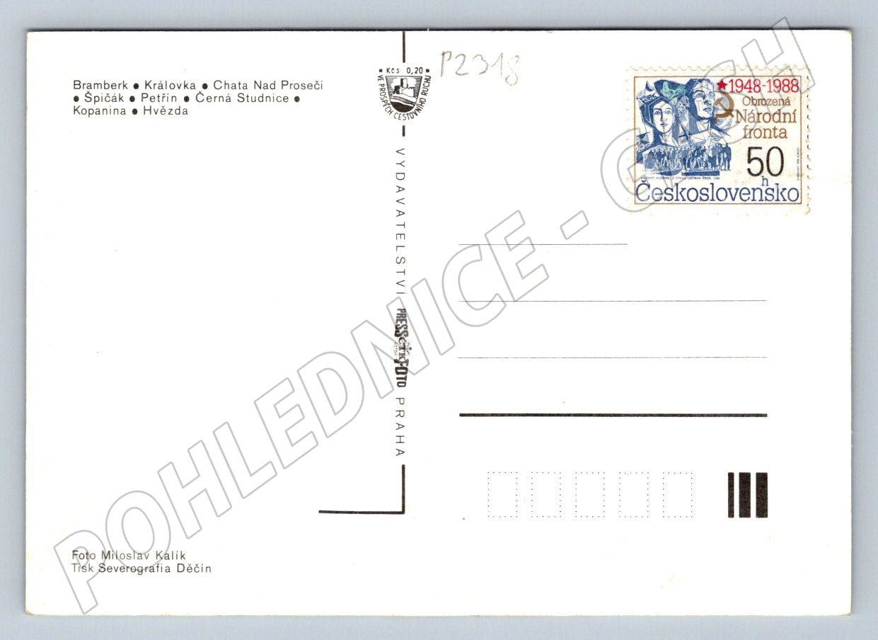 Nabízím originální pohlednici s více záběry rozhleden v Jizerských horách, vydanou v bývalém Československu. Na přední straně jsou barevné fotografie známých rozhleden: Bramberk, Královka, Chata nad Prosečí, Špičák, Petřín, Černá Studnice, Kopanina a Hvězda, všechny zasněžené v zimní atmosféře. Pohlednice pochází z 80. let 20. století, je opatřena známkou s motivem Národní fronty a nebyla poštovně použita. Vhodné pro sběratele pohlednic s tématikou rozhleden, hor, architektury nebo regionu Jizerské hory. Stav velmi dobrý, originální fotografie Miloslav Kalík, tisk Severografia Děčín.