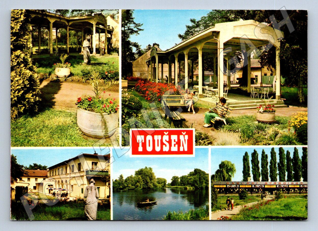 Originální pohlednice z lázeňského města Toušeň s barevnou koláží záběrů na lázeňskou kolonádu, okolní parky, řeku a areál lázní. Pohlednice byla zaslaná poštou, opatřena známkou Československo v hodnotě 30 h a ručně psaným vzkazem. Na zadní straně je věnování adresované do Prahy. Vhodné pro sběratele a milovníky historie českých lázeňských míst. Fotografie M. Poustka, tisk Severografia Velký Šenov. Stav odpovídá stáří, drobné známky opotřebení, viz foto.