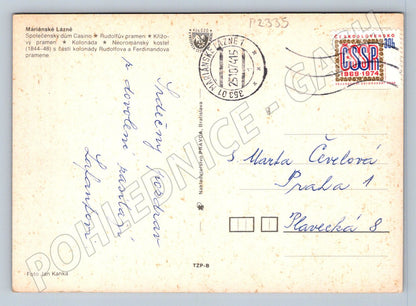 Originální pohlednice s více fotografiemi slavných budov a lázeňských míst v Mariánských Lázních. Na přední straně najdete krásné záběry kolonády, neorománského kostela, pramenů a záhonů květin. Zadní strana je vyplněna ručně psaným pozdravem, opatřena známkou a razítkem z doby Československa, což dokresluje dobovou atmosféru. Pohlednice je určena sběratelům i milovníkům historie. Formát pohlednice odpovídá starším standardům a jedná se o cenný doklad z minulosti známých českých lázní.