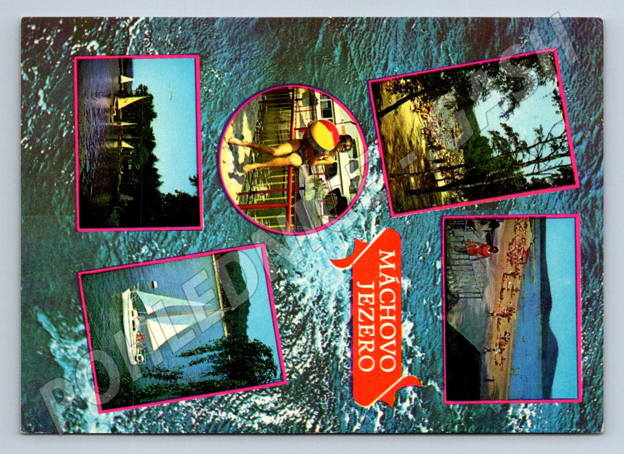 Barevná pohlednice s vícero záběry z Máchova jezera, oblíbeného rekreačního místa v Česku. Na pohlednici jsou vyobrazeny scenerie pláží, plavba plachetnicí i různé letní aktivity u vody. Vydal Orbis Praha. Stav velmi dobrý, bez popsání. Vhodné pro sběratele pohlednic s tématikou vodní dopravy či českých rekreačních lokalit. Rok vydání cca 70. nebo 80. léta 20. století.