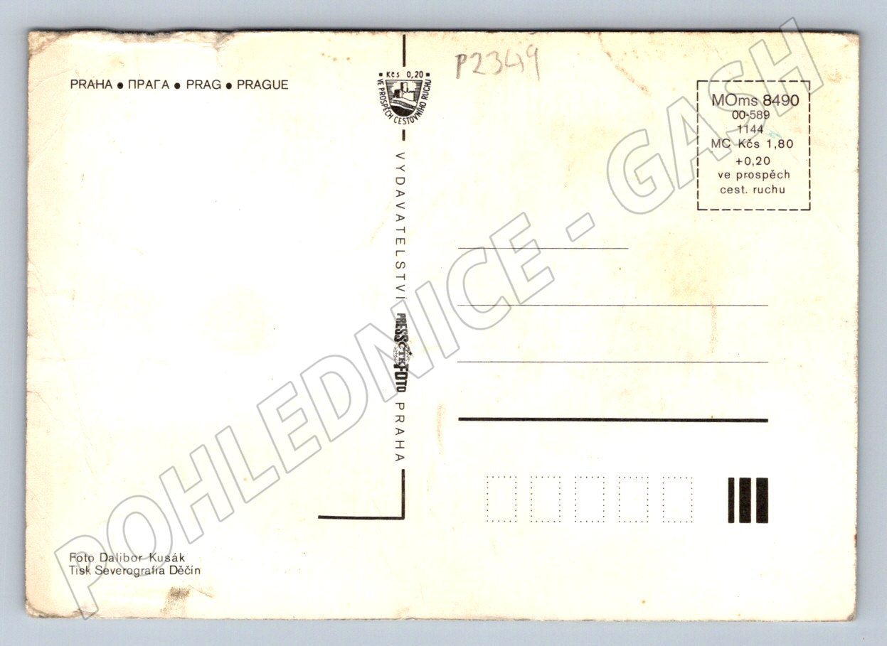 Originální pohlednice zobrazující panoramatický pohled na Prahu s Karlovým mostem a Pražským hradem. Na přední straně jsou vedle fotografie umístěny znaky jednotlivých pražských čtvrtí (např. Malá Strana, Hradčany, Staré Město, Žižkov aj.) a městský znak Prahy. Pohlednice nese typické znaky období Československa, na zadní straně je prostor pro známku a adresu, vydavatel Pressfoto Praha, tisk Severografia Děčín. Stav pohlednice odpovídá stáří – místy je lehce opotřebovaná a po stranách jsou patrné stopy používání. Rozměr pohlednice klasického menšího formátu. Vhodné pro sběratele historických pohlednic Prahy či zájemce o českou historii a heraldiku.