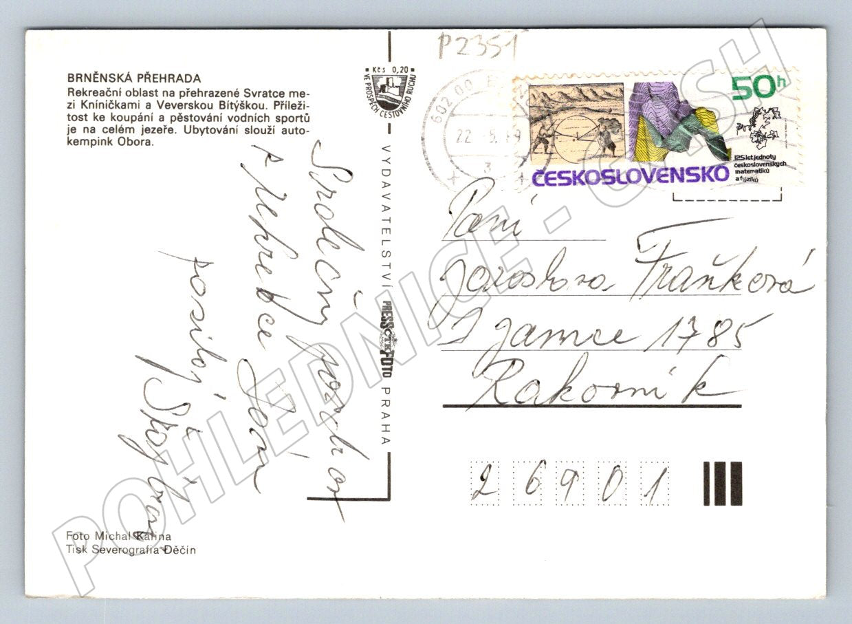 Pohlednice znázorňuje rekreační oblast Brněnská přehrada (Svratka) – oblíbené letní místo mezi Kníničkami a Veverskou Bítýškou. Na přední straně jsou zachyceny ikonické pohledy: plachetnice na přehradě, pláž s koupajícími se lidmi, stanový tábor a venkovní posezení u restaurace. Zadní strana je opatřena československou poštovní známkou a ručně psaným textem, což dokresluje dobovou atmosféru. Pohlednice je vhodná pro sběratele a milovníky jihomoravského regionu. Uvnitř stručný text o turistických možnostech oblasti. Pohlednice je ve výborném stavu, bez výraznějšího poškození.