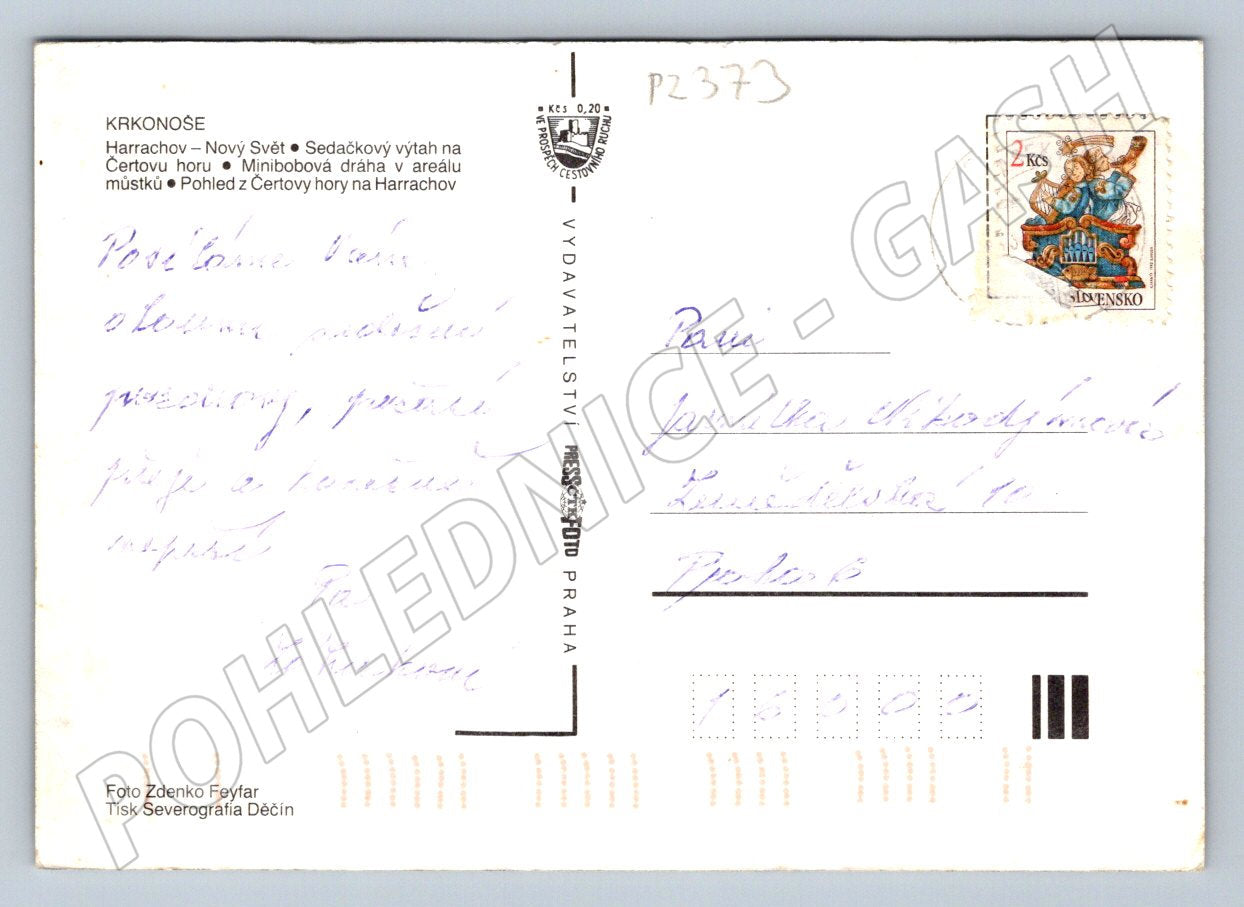 Pohlednice z oblasti Krkonoš – Harrachov. Pohlednice obsahuje více fotografií zobrazujících panoramata města Harrachov, okolní krajinu, areál skokanských můstků, sedačkovou lanovku a bobovou dráhu. Na zadní straně je ručně psaný text a známka. Foto: Zdenko Feyfar, vydavatelství Severografia Děčín. Zachovalý stav, vhodná do sbírky či jako vzpomínka na známé horské středisko.
