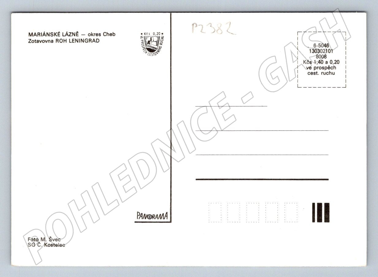 Originální pohlednice z Mariánských Lázní zobrazující zotavovnu ROH Leningrad. Na pohlednici jsou zachyceny exteriéry této zajímavé stavby, pohled na hlavní budovu z různých úhlů a interiéry jídelny a společenské místnosti. Pohlednice pochází z období po roce 1950, kdy podobné objekty sloužily k rekreaci zaměstnanců v rámci ROH (Revoluční odborové hnutí). Stav zachovalý, vhodný do sbírky jako dobový dokument lázeňské architektury a rekreace v Československu. Rubová strana nevyplněná, tisk PANORAMA, autor fotografie M. Švec. Velký formát.