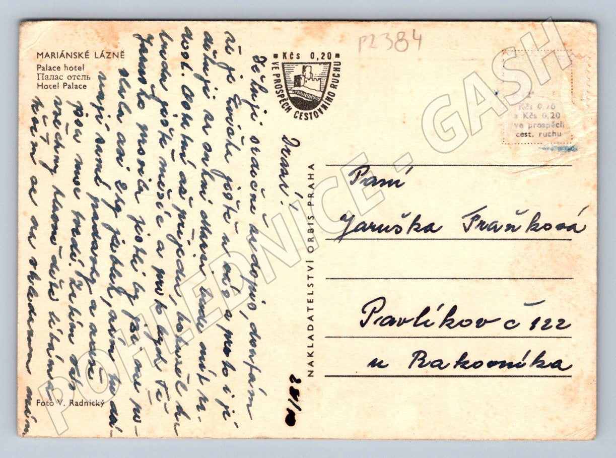 Originální pohlednice z Mariánských Lázní zobrazující známý Palace Hotel na kolonádě. Pohlednice je kolorovaná a zachycuje detailně rušný život v Mariánských Lázních. Na přední straně je krásný architektonický pohled na historický hotel a okolí, na zadní straně osobní ručně psaný vzkaz s adresou příjemce. Vydáno nakladatelstvím Orbis Praha, foto V. Radnický. Pohlednice nese známky poštovního provozu, včetně razítka a známky. Ideální do sbírky historických pohlednic českých lázeňských měst nebo architektury. Stav přesně dle fotografií.